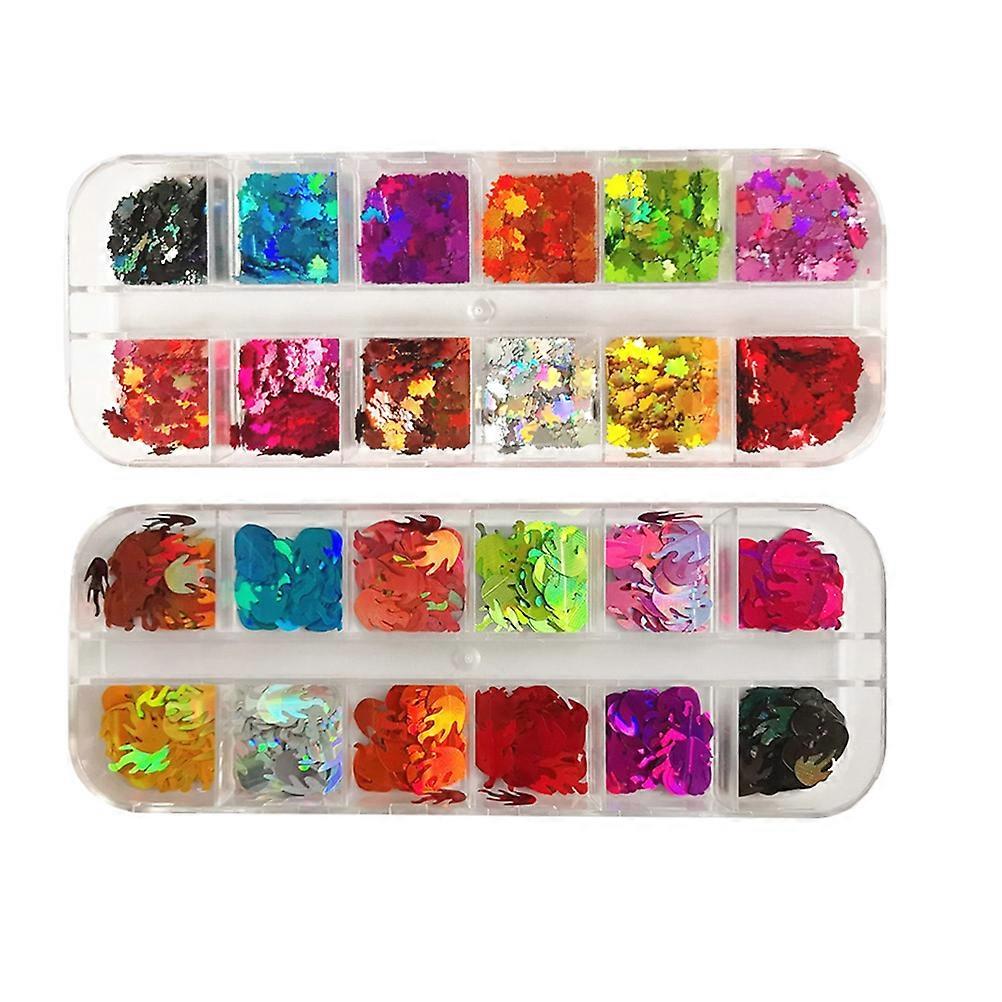 2 Boxed 12 Colors Nail Glitter Sparkly Paillettes Manicure Decor for Lady (Flame Pattern 1 and Maple Leaf Pattern 3)