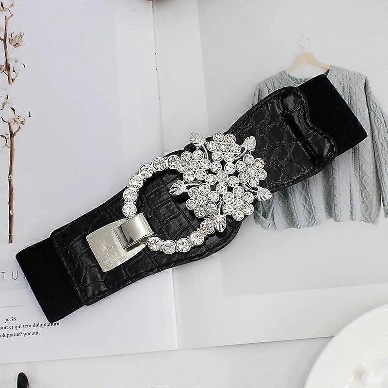 2021 Belts for Women Black Simple Waist Elastic Ladies Band Metal Belt Buckle with Diamond Decoration Coat Sweater Fashion Dress