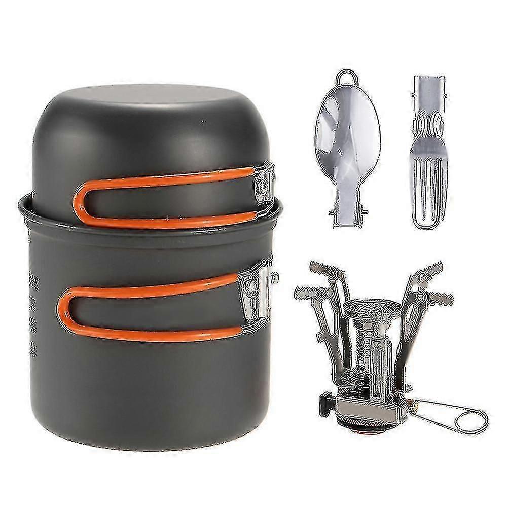 The cook stove set will be a good choice for people who love hiking, camping, picnic and party.Features:The pot and pan are made of anodised aluminum, which makes it solid and light.Both the pot and pan have folding handles for space saving and compactness.The mini camping stove is made of aluminum alloy and stainless steel which can stand high temperature and weight.The folding fork and spoon can be stored in the pot.Stored together in a mesh bag for convenient carry.It is lightweight and doesn't take up much room in your pack.It will be a good choice for people who love hiking, camping, picnic and party.Specifications:Material: Aluminum alloy &Stainless steelPot size: 12 * 10.5cm / 4.7 * 4.1in (D * H)Pan size: 11.5 * 6cm / 4.5 * 2.4in (D * H)Stove size: 7 * 7.5cm / 2.8 * 3.0in (D * H)Product Weight: 500gPackage Size: 12.5 * 12.5 * 17cm / 4.9 * 4.9 * 6.7inPackage List:1 * Pot1 * Pan1 * Mini stove1 * Mesh bag1* Spoon1* ForkNotes:This cooking set is advised for 1 - 2 people use. This advice is for reference only in consideration for that everyone's food consumption capacity is different.Please allow 1 - 2cm (0.4 - 0.8") differences due to manual measurement, thanks.Products from Bazhou's store