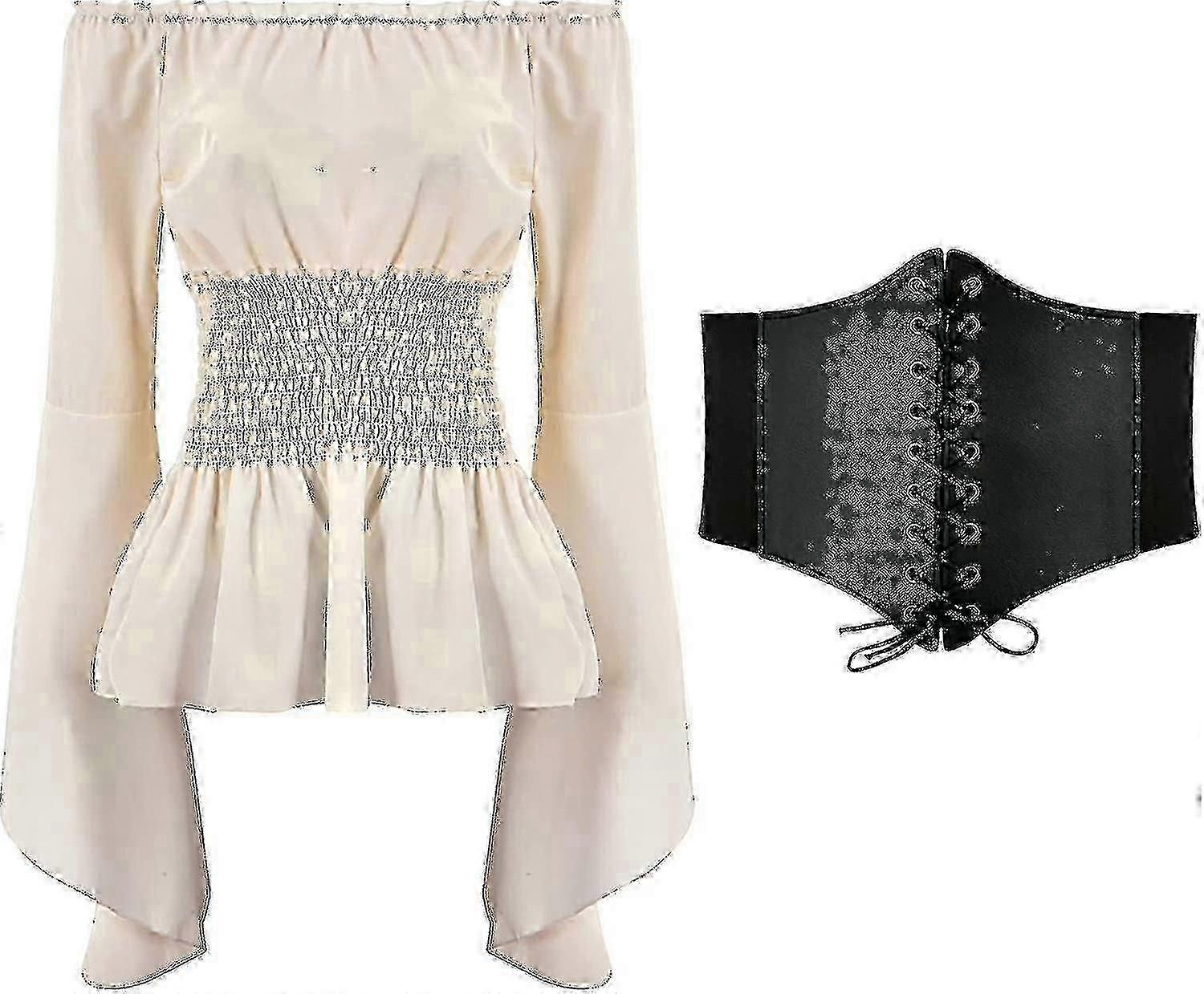 2023 Womens Renaissance Blouse Tops Corset Waist Belt Medieval Victorian Off Shoulder Long Sleeve Shirt Pirate Cosplay Fast-zong