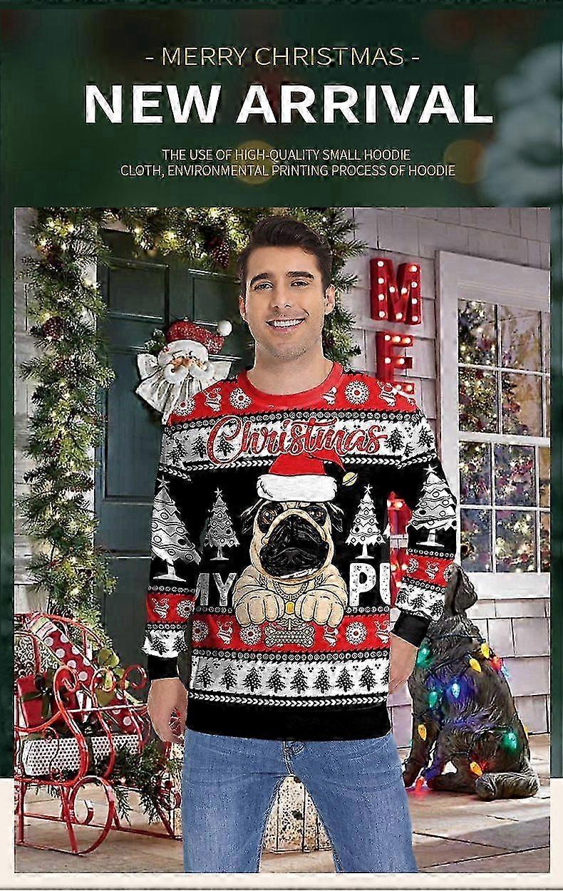 2025 Men's Christmas Sweatshirt Cute Pug Dog Print Holiday Pullover with Festive Tree & Santa Hat