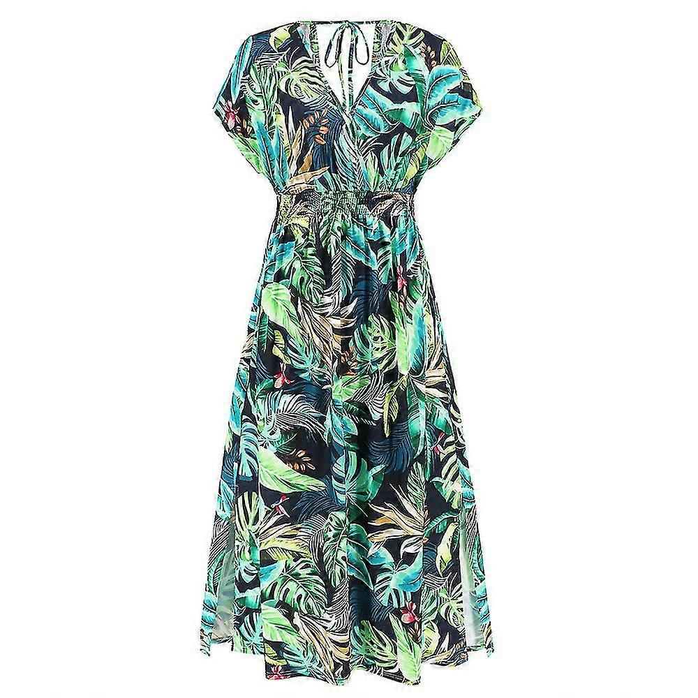 2025 Bat Sleeve V-neck Backless Strap-up Dress Summer Women's Printed Long Skirt