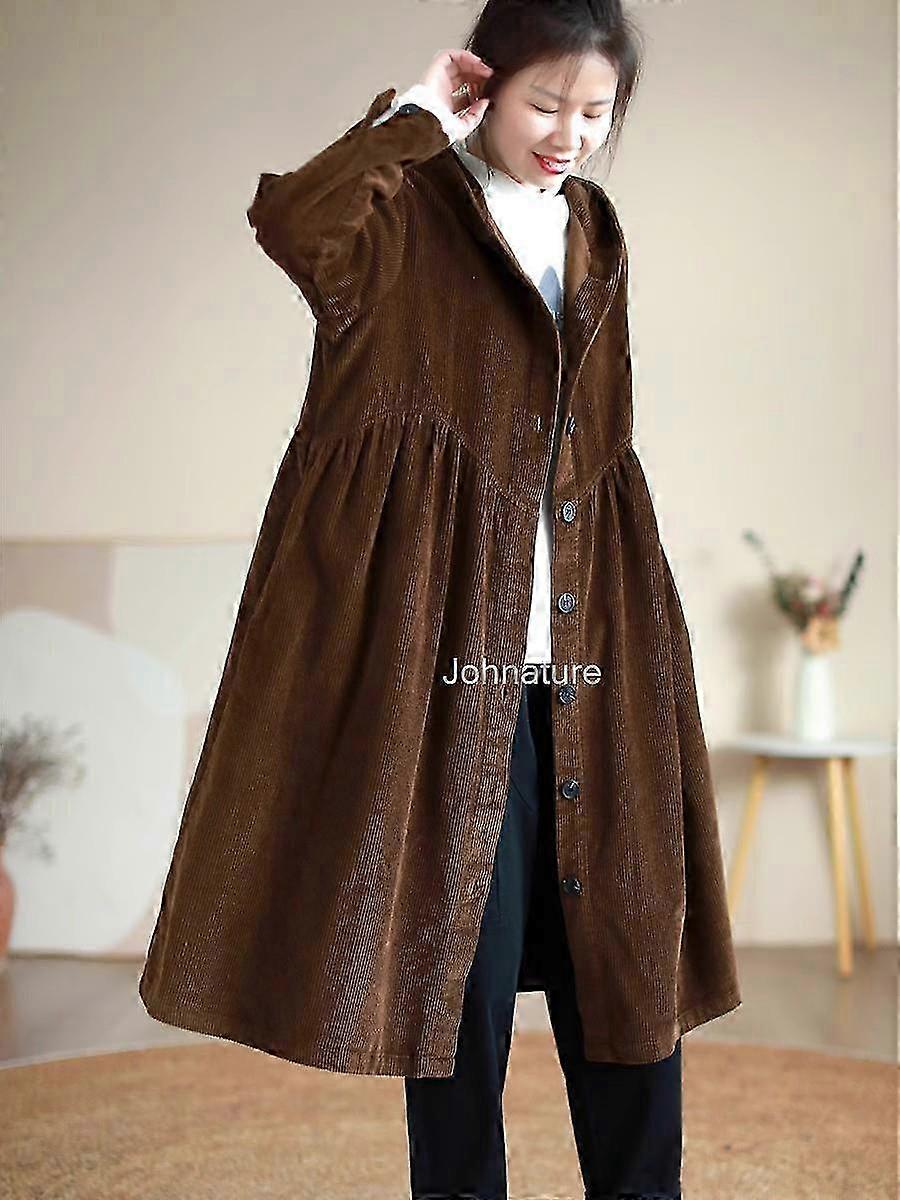 2025 Johnature Women Vintage corduroy Hooded Trench Button Solid Color Long Sleeve Warm Coats