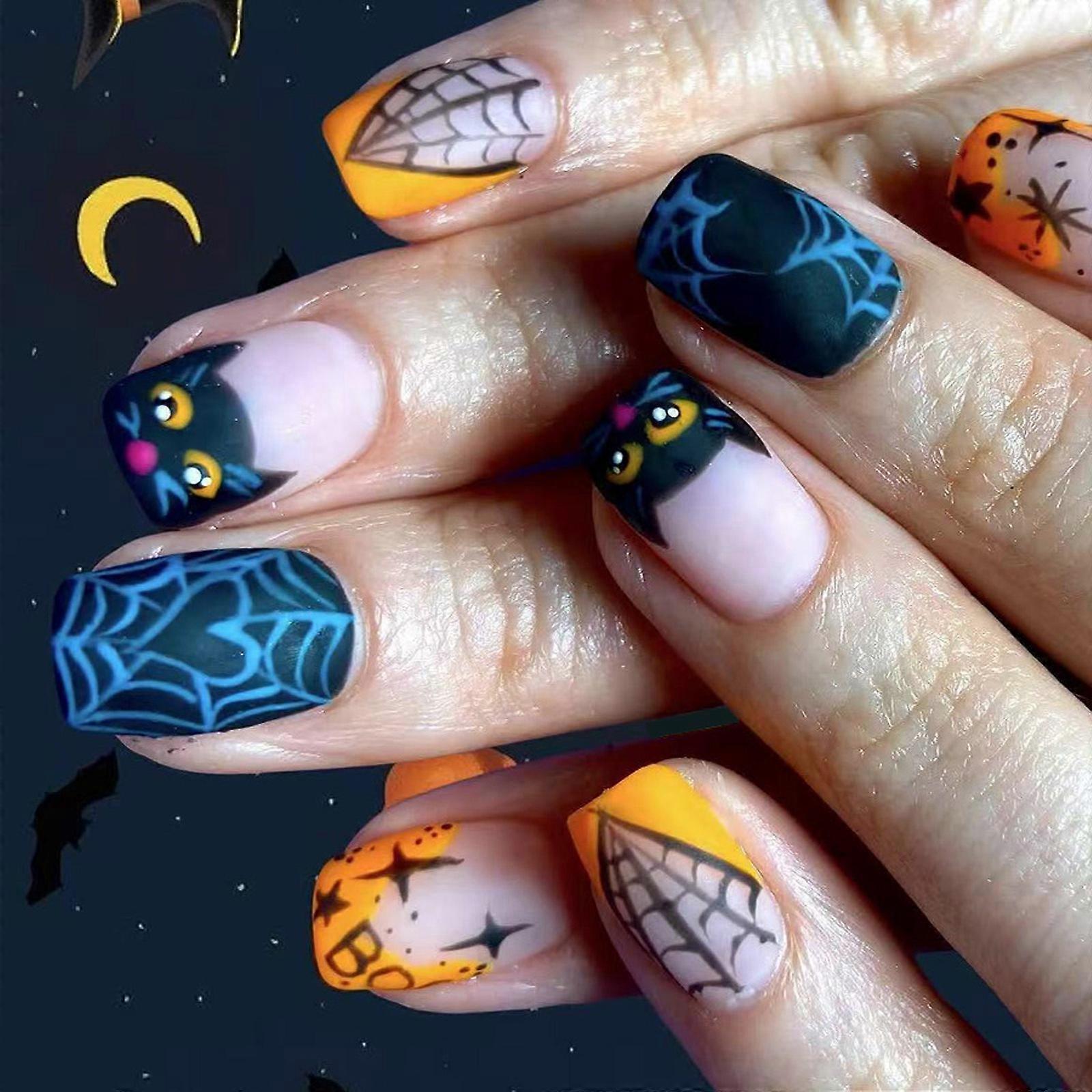 24 Piece Halloween Orange French Cobweb Gothic Press On Nail With Dark Bat Design And Black Glittering For Women Party Multicolor