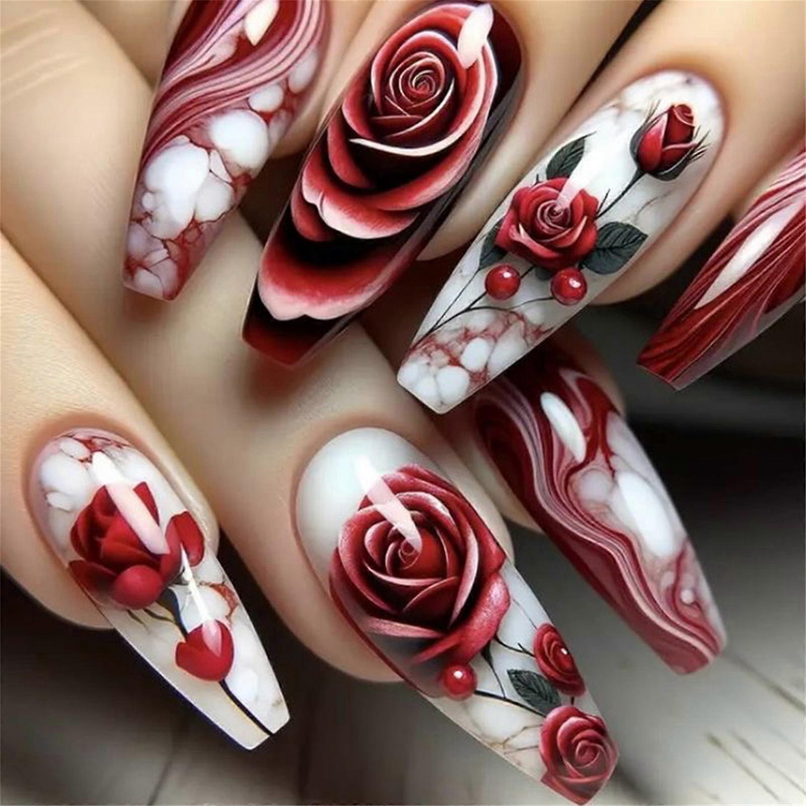 24 Pcs Valentines Day Press On Nail Flowers False Nail Glossy Acrylic Nail Medium Ballerinas Stick on Nail