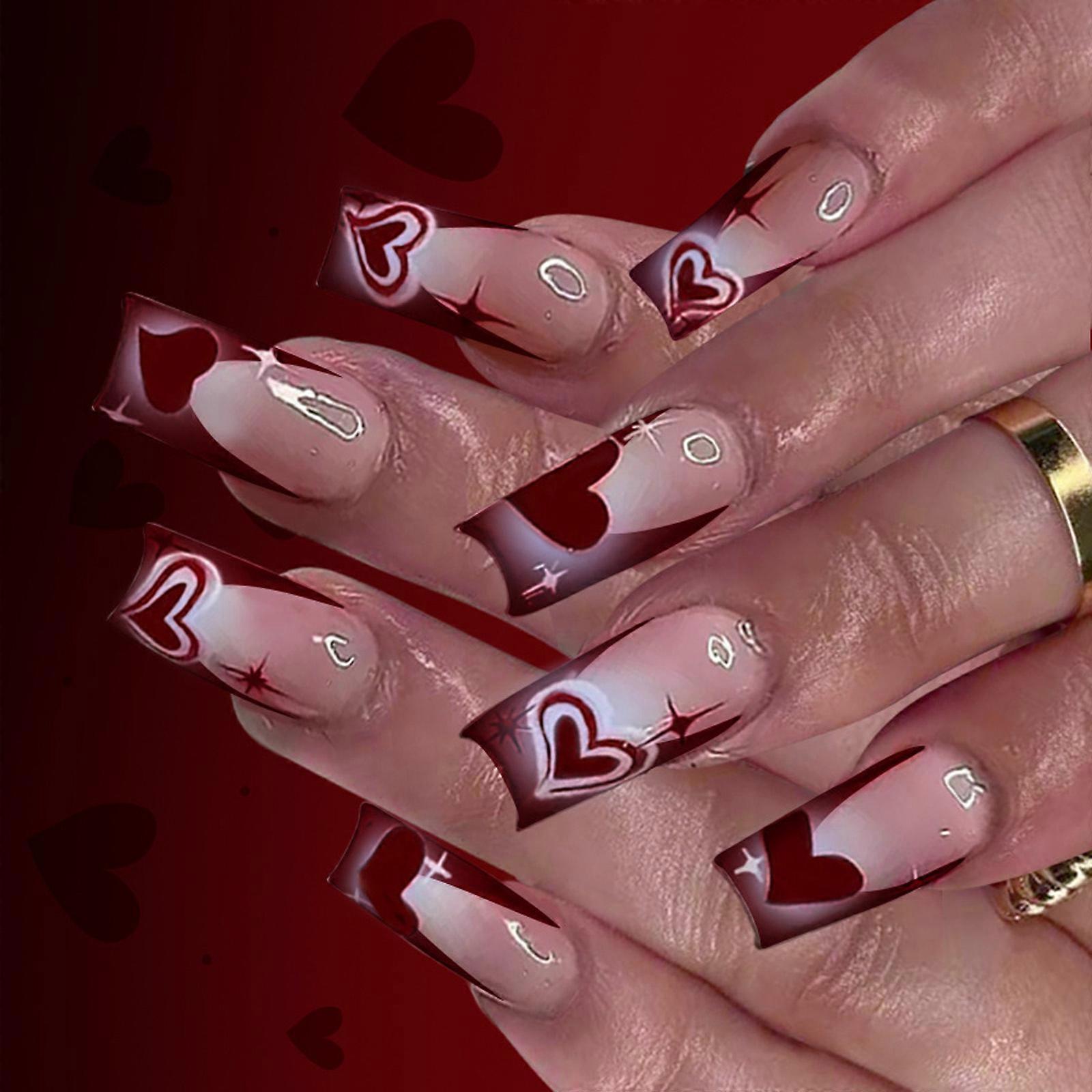 Glitters Press On Nail 24PCS Wine Red Heart French Manicure Glossy Fake Nail For Dates Parties Artificial Fingernails Multicolor