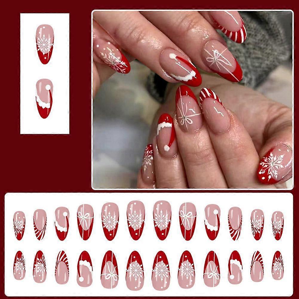 24PCS Red French Pointed Nails Christmas Fake Nails With Snowflake Christmas