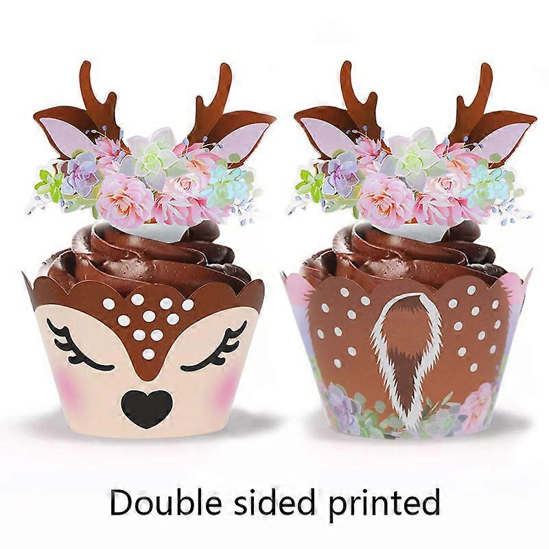 24/48pcs Cartoon Sika Deer Cupcake Wrapper Antlers Paper Cake Toppers Merry Christmas Xmas New Year Birthday Party Decoration
