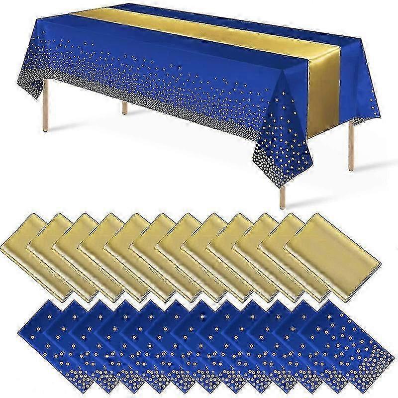 24Pack Disposable Plastic Tablecloths and Satin Table Runner Set Blue and Gold Dot Tablecloth Gold Satin Table Runner for Wedding Birthday Baby Shower