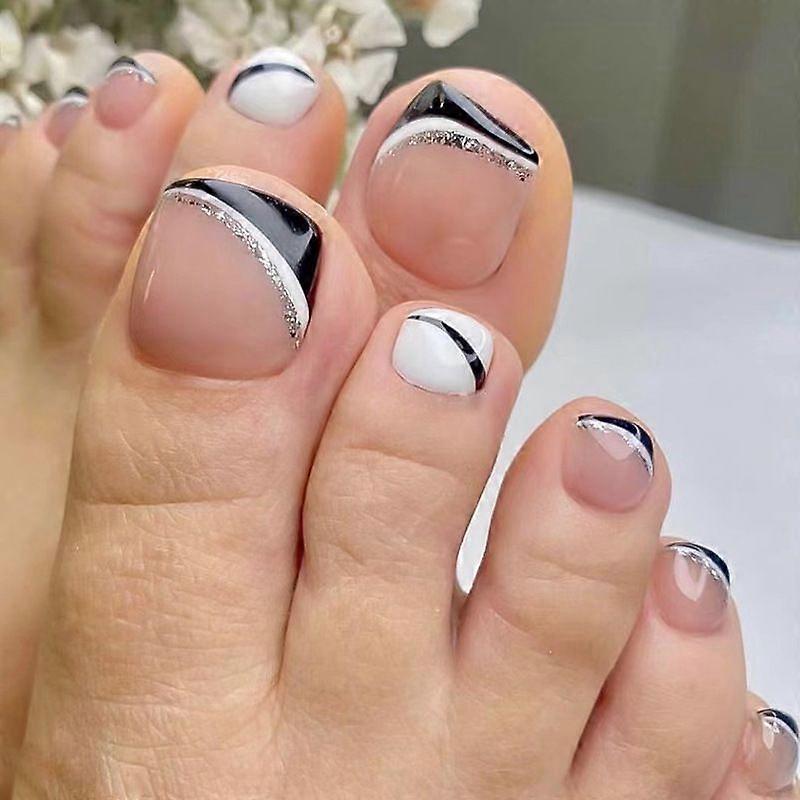 24pcs Black and White Glitter Toenails Wearable Manicure Nail Patches Finished Nails Ladies Glossy Artificial Toenails