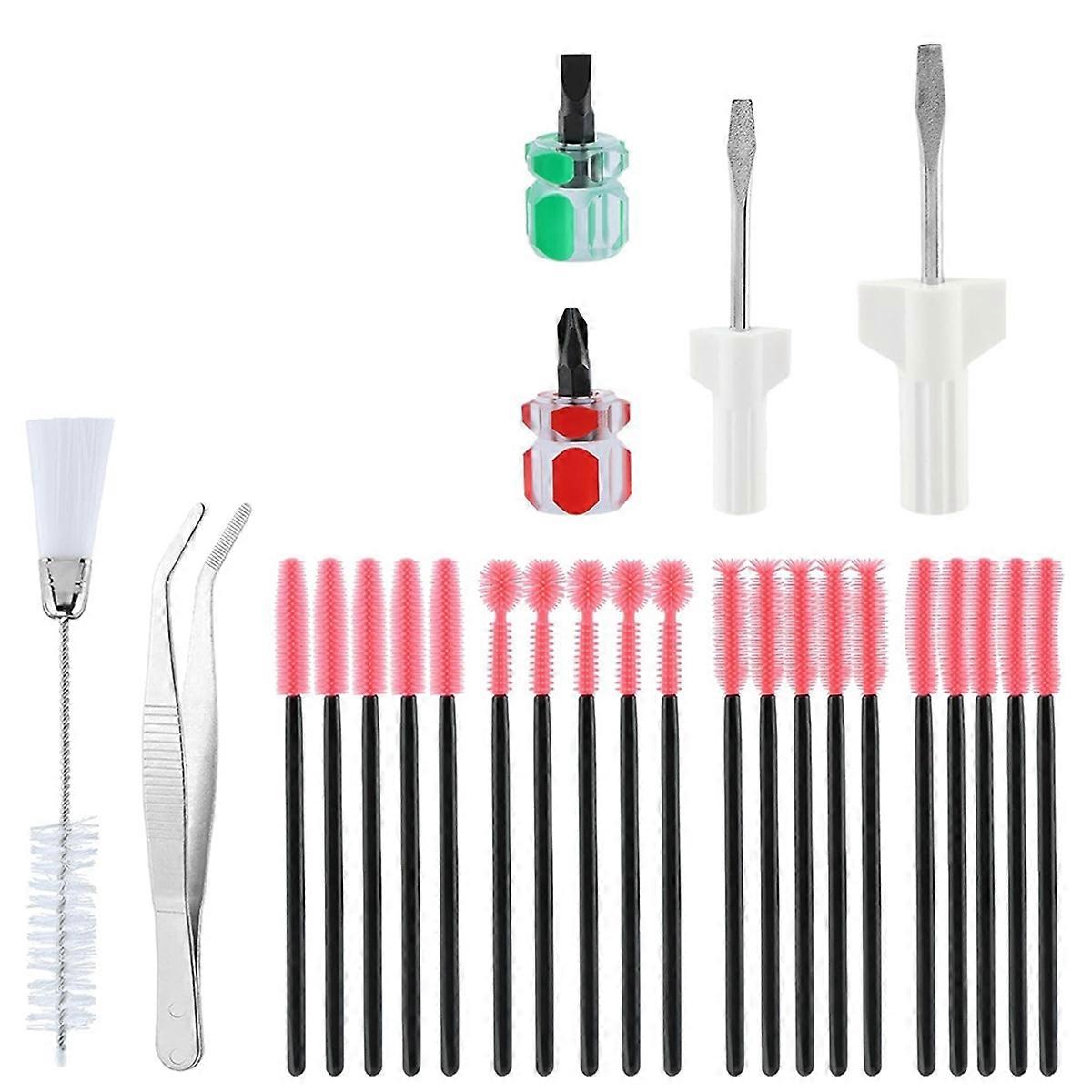SEW MACHINE CLEANING KIT: You get 20pcs sewing machine cleaning brushes(5pcs black rod deep pink, 5pcs tower-shaped + 5pcs ball-shaped + 5pcs knife-shaped + 5pcs pineapple-shaped), 1pc 12.5cm curved tweezer,1pc double-ended brush,1pc red handle cros-s screwdriver,1pc green handle flat head screwdriver,2pcs white flat head screwdriver,enough quantities for daily sewing machine cleaning work. FOR DETAIL CLEANING: This cleaning tool is equipped with thin yet dense silicone bristles. This design allows the brush to deeply penetrate narrow corners and crevices of sewing machines, effectively cleaning away stubborn dust, and threads. This superb detail-oriented capability ensures a much cleaner and smoother running condition for your sewing machine. WITH CLEANING TOOL SET: Also come with 6pcs sewing machine cleaning tools, the kit includes six different sewing machine repair tools, which can meet your different repair needs. It is ideal for cleaning of cotton velvets on the to keep your sewing machine clean. Easy to use, easy to operate, easy to maintain, practical accessories, reliable to use. MULTI TYPES OF CLEANING BRUSH: This cleaning brushes set includes 4 differently shaped silicone brush heads, each of them can reach narrow gaps. This generous quantity ensures your long term maintenance needs are fully covered. Maintain a clean sewing environment effortlessly. WIDE USE: This cleaning brushes set are not only suitable for sewing machines but also for cleaning narrow crevices in items such as mobile phones and computer keyboards,making it a versatile and cost-effective tool.It is ,flexible,and ,ensuring long-lasting cleaning performance. Colour:Black & Red Material:Metal+Plastic Package Contents: 20 * brushes 1 * double-ended brush 1 * tweezer 4 * screwdriver Only the above package content, other products are not included. Note: Light reflection and different displays may cause the color of the item in the picture a little different from the real thing. The measurement allowed error is +/- 1-3cm.