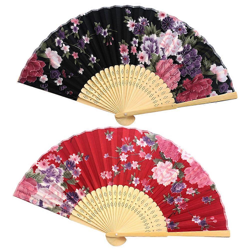 2pcs Party Folding Fan Vintage Style Collapsible Fan Flower Hand Fan Retro Elegant Floral Fan For Summer Hawaiian Party Decor(Black and Red)