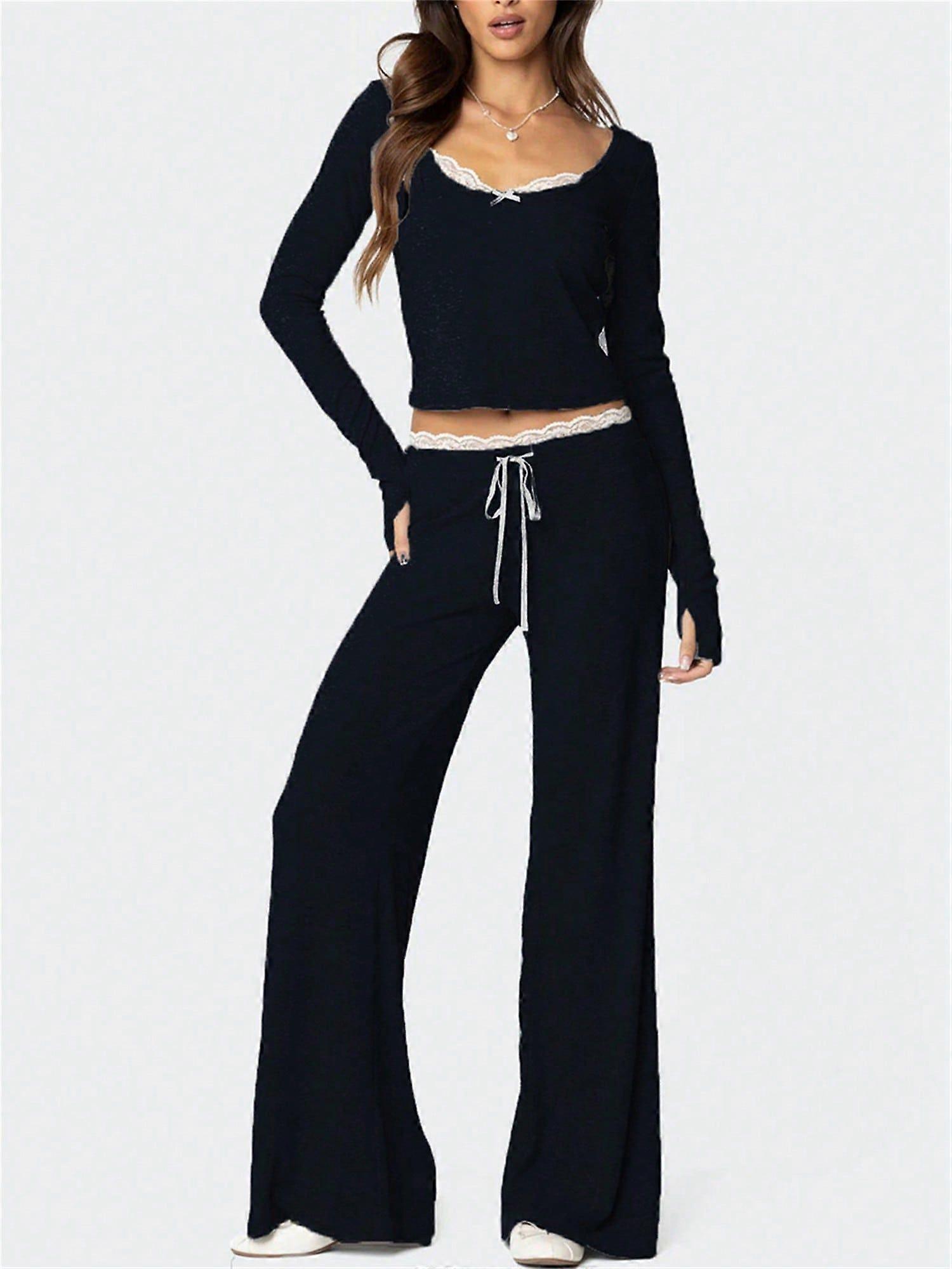 2pcs Women's Pajama Set Long Sleeve Top With Wide Leg Pants Lounge Sets Sleepwear Loungewear
