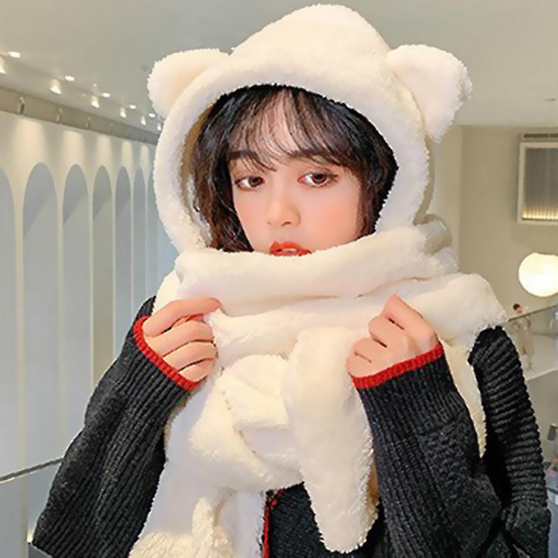 3 In 1 Hat Scarf Gloves Set Winter Warm Cute Bear Ears Plush Hoodie Cap Casual Solid Thicken Cotton Wool Women Hat