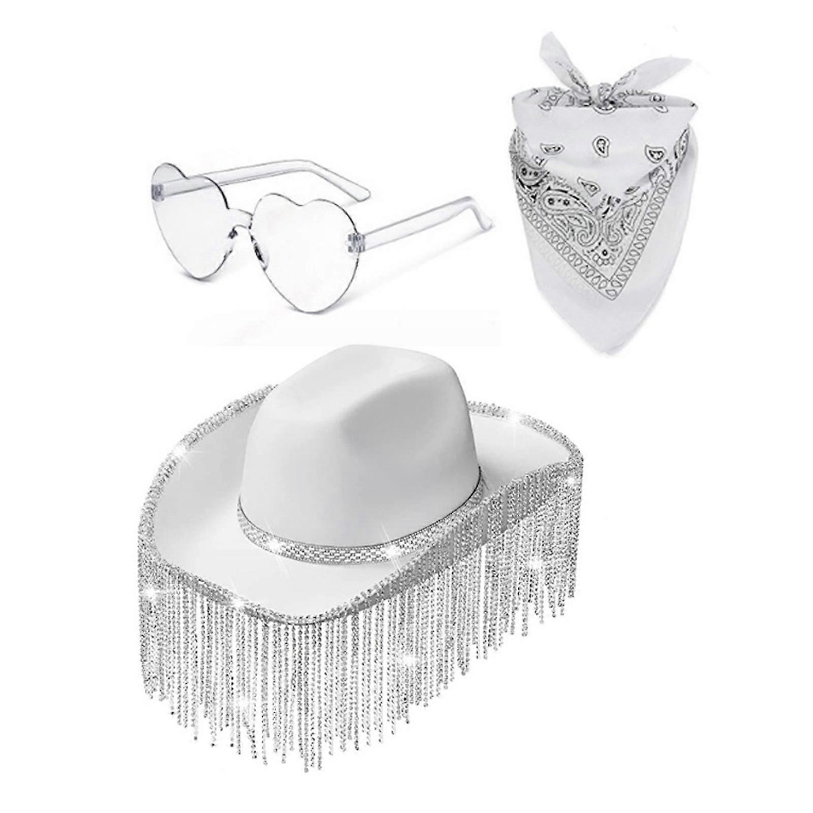 3pieces Rhinestone Cowboy Hat&Heart Sunglasses+Kerchief Set For Woman Wedding Hat Western Elegant Dress Accessory White