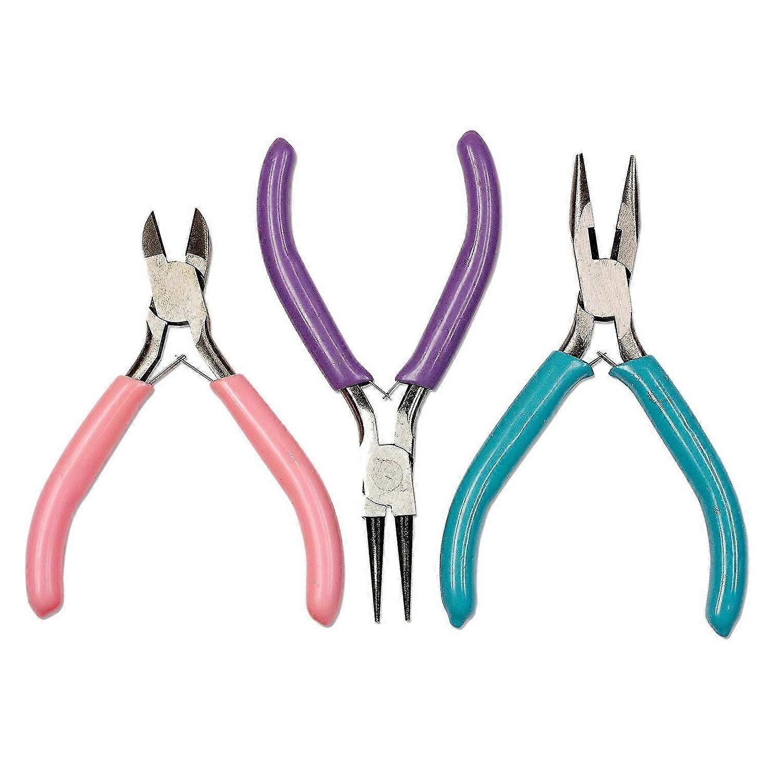 Jewelry crafters love this convenient pack of essential tools. Three tools in one pack,includes a Needle Nosed Pliers with an aqua colored handle a Round Nose Pliers with handle and Side Cutters with pink handles The curved-edges of the round-nosed pliers make forming loops and curves a pleasure Long needle-nose pliers are versatile for picking placing shaping and holding objects. Heavy-duty cutting tool is for cutting through hard temper wires (like memory wires and floral wire). Both pliers are 4-7/8 from top to bottom and the Side Cutters are 4-3/8 from top to bottom. Warning! Keep out of reach of children. Not a toy or for use by children. Warning: Wear safety goggles. User and bystander. colour:Photo Color Material:PP+ steel size:4.5 inch Package Contents: 1 * Diagonal pliers 1 * Needle-nose pliers 1 * Round nose pliers Only the above package content, other products are not included. Note: Light and different displays may cause the color of the item in the picture a little different from the real thing. The measurement allowed error is +/- 1-3cm.