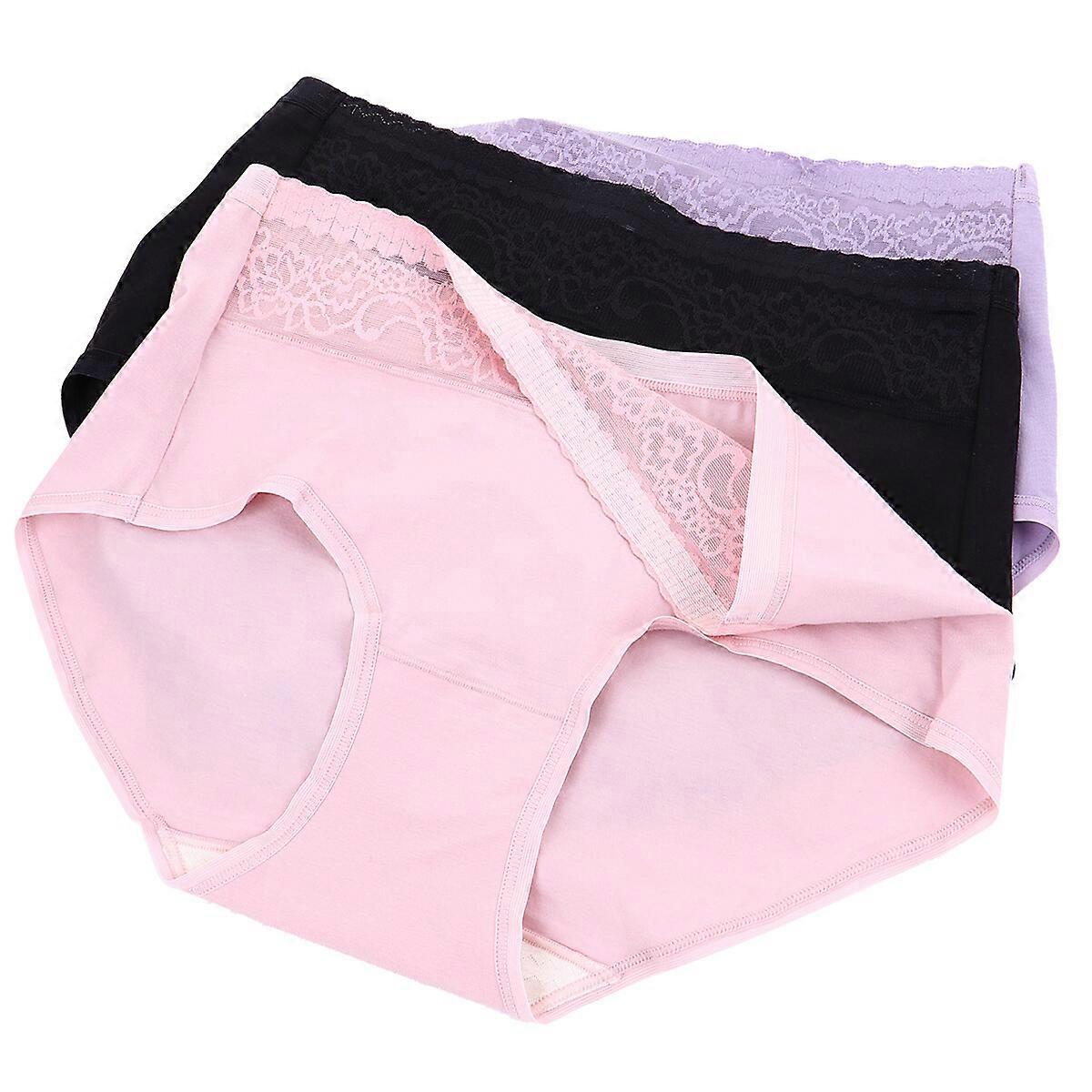 3pcs Lace Sexy Female Panties Breathable Underpant Middle Waist Briefs Cotton Underwear for Women - Size XL(Black, Pink, Purple with Grey)