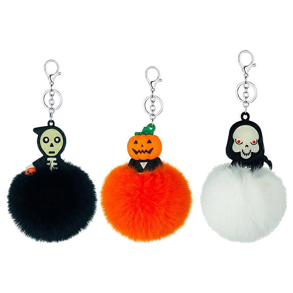 3pcs PVC Hair Ball Keychains Halloween Keyrings Decor Hanging Key Chains for Car Key Bag Phone (Pumpkin Monster, Ghost, Death)