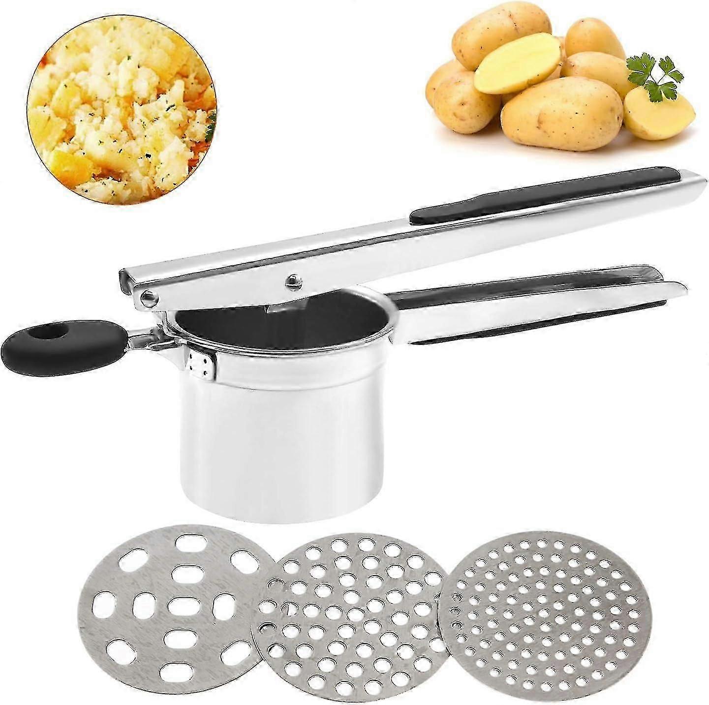 1. Safe materials Potato masher made of stainless steel, strong and durable, fine polished and smooth surface, safe and long operating time, be careful that the potato press can only press cooked food, if you press on raw food, it can do the Damage the potato press.^2. Ergonomically designed Long handle with ergonomics, full use of the lever principle, the grippy handles reduce pressure, stress and tension on the hands and wrists while effortlessly mashing, just put the food in the slot and press! Easy to prepare delicious meals in seconds.^3. Different specifications The stainless steel potato press comes with 3 replacement steel grids, each with a different hole diameter. Compared to other potato recipes, these are fine, medium and coarse slices that can be pressed as needed You are better at handling different foods depending on your needs.^4. Efficient and Kitchen Helper The potato press is not only used for potatoes, but can also be used for other cooked vegetables such as purple potatoes, carrots and pumpkins, you can also use it to prepare healthy baby food or join a four-pointer. One of the fresh juices in oranges and lemons, simply heat or boil for harder vegetables and fruits.^5. Easy to clean It can be instantly disassembled and reassembled for cleaning, simply rinsed under the tap or safely cleaned in the dishwasher. Easy to clean and safe to rinse in the dishwasher. Be careful not to use steel balls Drying with a cloth after cleaning will make it less rusty.