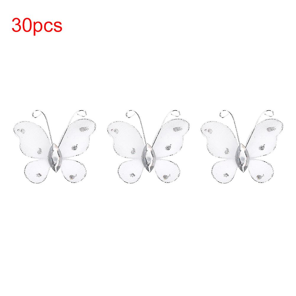 30pcs Wired Mesh Glitter Butterflies with Artificial Gem DIY Handmade Crafts for Weeding Party Home DecorationWhite