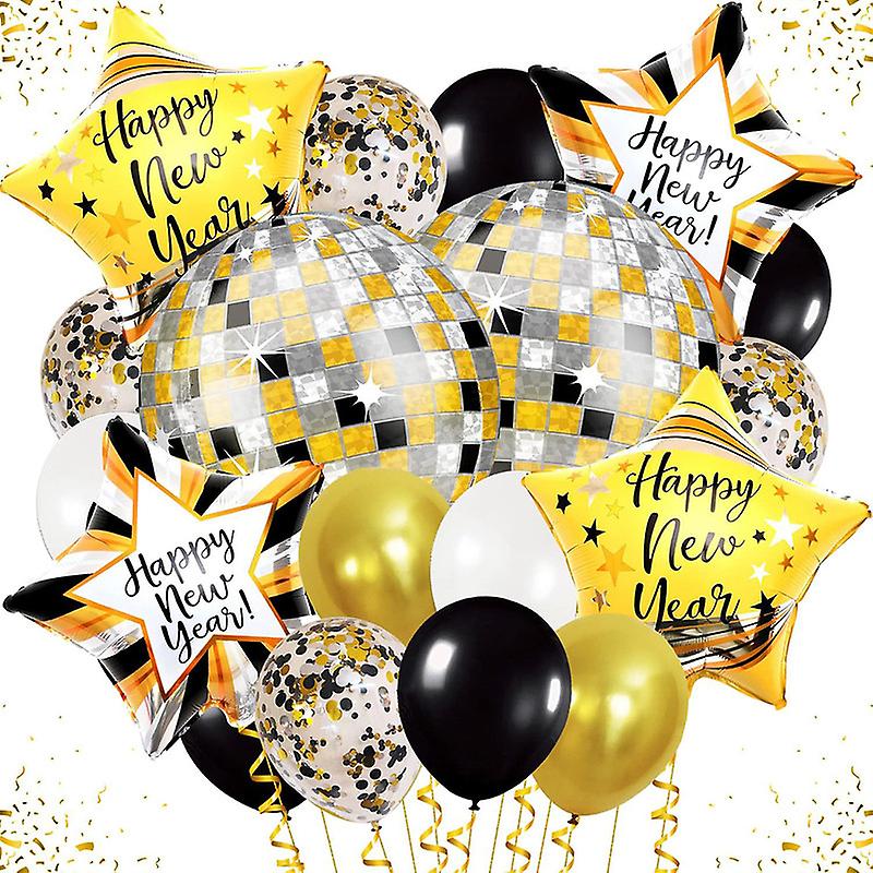 LARGE PACK OF 38 | HIGH-QUALITY PREMIUM: The Happy New Years balloons are available in different design with Disco foil balloons Happy New Year 22 Inch, Pack of 2 , Happy New Year Star Balloons 18 inch, pack 2, Happy new Year strip star Balloons - 18 Inch, Pack of 2.Gold, Black, and white Latex balloons 12 Inch, Pack of 27, Confetti balloons 12 Inch. The 2024 New years eve decorations are made from aluminum mylar foil material, durable and reusable.