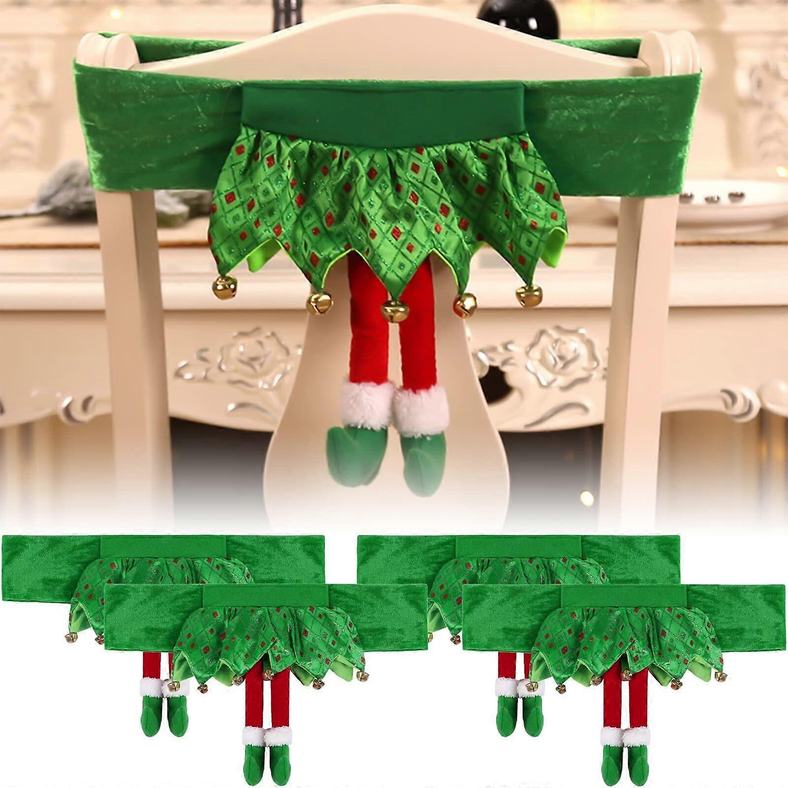 4PCS Christmas Elf - Themed Chair Back Covers with Jingle Bells - Stretchy Green Chair Sashes Decorative Slipcovers for Holiday Season, Wedding, Party