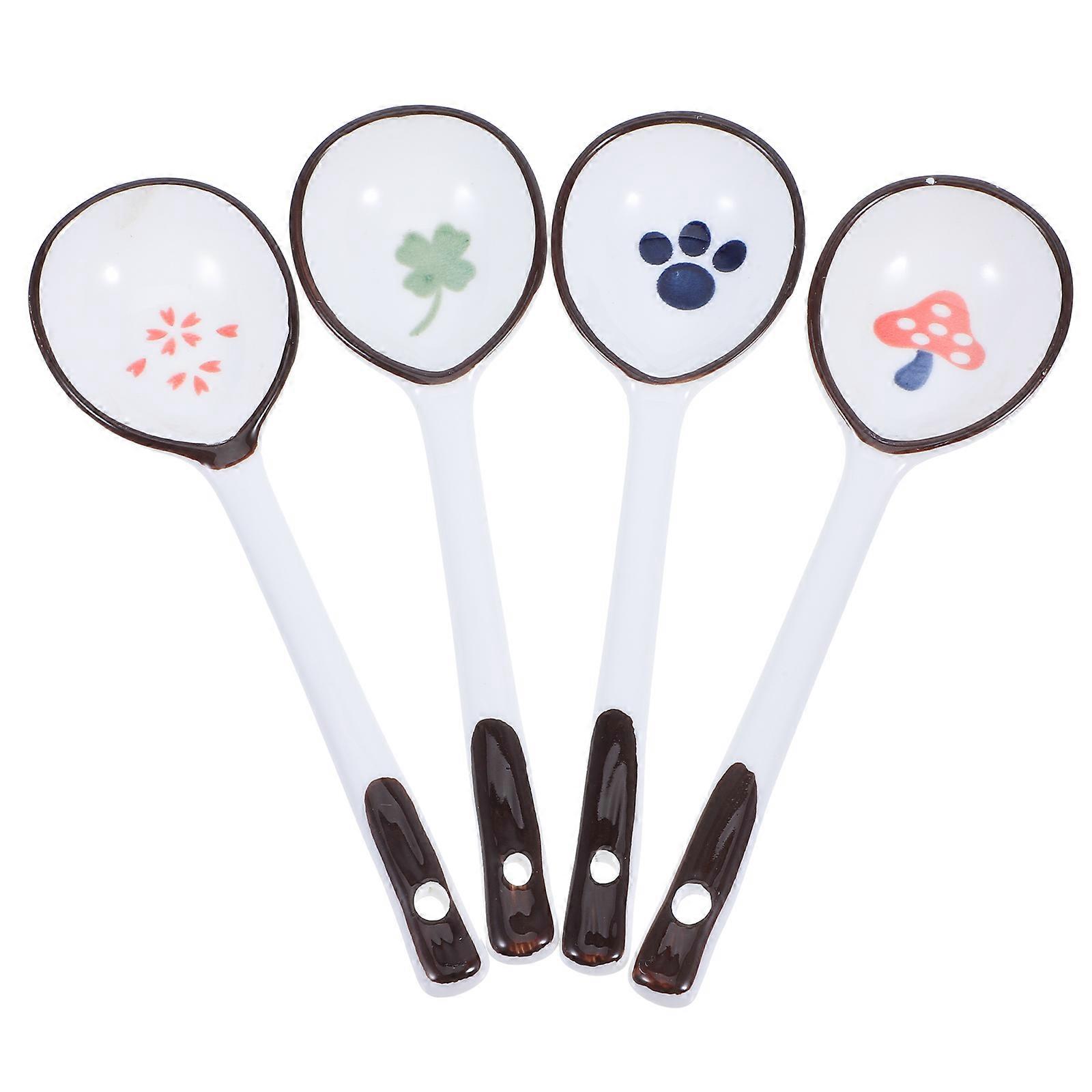 4pcs Long Handle Ceramic Soup Spoons with Hand Painted Cartoon Design in Blue, Pink, Green, Red – Lightweight Porcelain Dinnerware for Home and