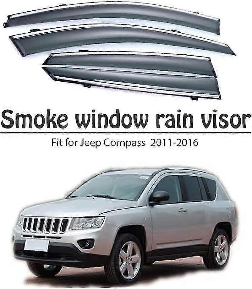 It can prevent rain, snow, wind and sunlight from entering, and the window can be opened when it rains to prevent the window from fogging. It is also an ideal choice for smokers due to the optimized supply of fresh air for vehicle interior ventilation.<br><br> Specification:<br>Product Name: Rain Wind Deflectors.<br>Material: high quality material.<br>Quantity:4pcs/set<br><br> What do wind deflectors do?<br>- Wind Deflectors are also known as door rain deflectors, rain guards or window guards. They maximize comfort while driving and increase air flow through the car, reducing wind turbulence and buffeting inside the cabin.<br>- Theyre constructed from a lightly tinted scratch resistant durable plastic material which can withstand heavy car wash treatment and do not hinder side mirror visibility. Wind deflectors have a sleek and aerodynamic design and make a great addition to any vehicle.<br><br> Package Included:<br>4pcs Wind Deflectors<br> APPLICABLE MODEL: for Jeep Compass 2011 2012 2013 2014 2015 2016.<br> PROTECTION: The product is installed on the edge of the car window, wind deflectors are designed to allow you to keep your window open slightly and preventing rain and snow from entering, disperse cigarette smoke. Not have rain drip into your cab and the wind deflectors will also reduce wind noise when you have your windows open.<br> PERFECT APPEARANCE: The ventilated sun visor not only protects the windows from wind, rain and snow, and keeps fresh air in, but also ensures a bright appearance, provides eye-catching effects and personalizes your car.<br> HIGH-QUALITY MATERIALS : The window rain cover trim is made of high-quality materials, which is an indispensable item for sun protection, wind and rain, and is very suitable for car decoration.<br> EASY TO INSTALL: No special hardware or drilling is required. Wipe clean first to ensure that the location to be installed is free of dust. Remove the 3M glue on the back of the product, and then press on the location to be installed. Do not wash the car within 48 hours.<br> APPLICABLE MODEL: for Jeep Compass 2011 2012 2013 2014 2015 2016.<br> PROTECTION: The product is installed on the edge of the car window, wind deflectors are designed to allow you to keep your window open slightly and preventing rain and snow from entering, disperse cigarette smoke. Not have rain drip into your cab and the wind deflectors will also reduce wind noise when you have your windows open.<br> PERFECT APPEARANCE: The ventilated sun visor not only protects the windows from wind, rain and snow, and keeps fresh air in, but also ensures a bright appearance, provides eye-catching effects and personalizes your car.<br> HIGH-QUALITY MATERIALS : The window rain cover trim is made of high-quality materials, which is an indispensable item for sun protection, wind and rain, and is very suitable for car decoration.<br> EASY TO INSTALL: No special hardware or drilling is required. Wipe clean first to ensure that the location to be installed is free of dust. Remove the 3M glue on the back of the product, and then press on the location to be installed. Do not wash the car within 48 hours.