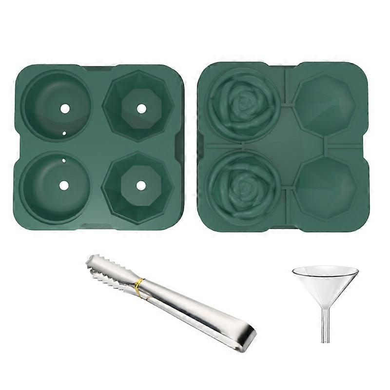 4-Holes Rose Diamond Shape Cocktail Ice Cube Molds Silicone Ice Ball Maker Rose Shape (Dark Green with Ice Clip)