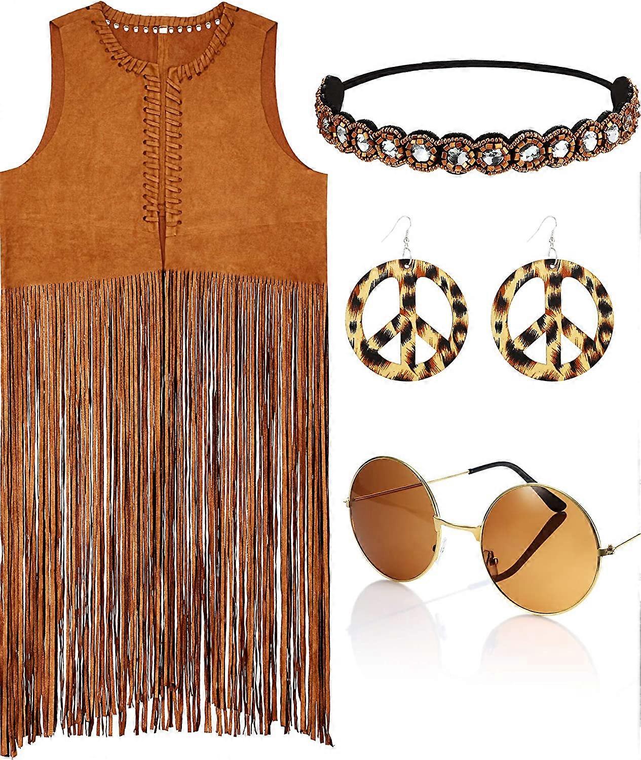 4 piece Women Hippie Costume Set Fringe Vest Faux Seude Tassels vest