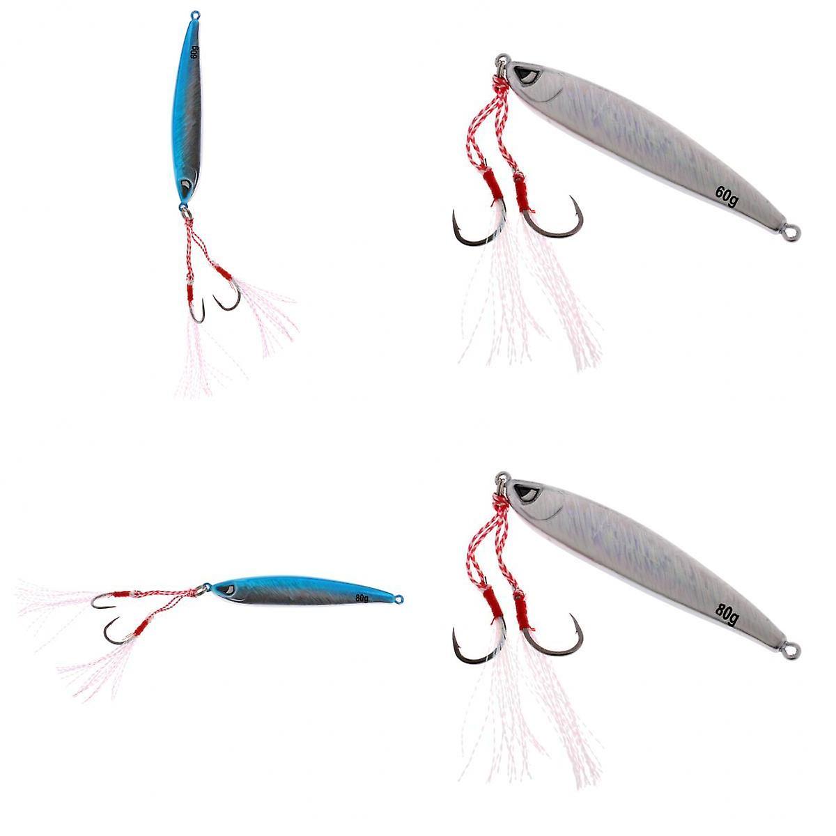 Description: High strength carbon steel hooks, strong grasping power. Bright color, colorful and reflective, very attractive to all kinds of fishes. They create life-like swimming actions in water. Hard and heavy lure, suitable for wind weather and long distance casting. Suitable for herrings, sturgeon, other big etc. Specification: Material: 60g, Body Length: 8.8cm/3.5inch; Body width: 1.5cm/0.6inch; Total Length: 13.5cm/5.3inch(2pcs) 80g, Body Length: 9.5cm /3.7inch; Body width: 1.7cm/0.7inch; Total Length: 14.5cm/5.7inch(2pcs) Package Includes: 4 Pieces Fishing Lure