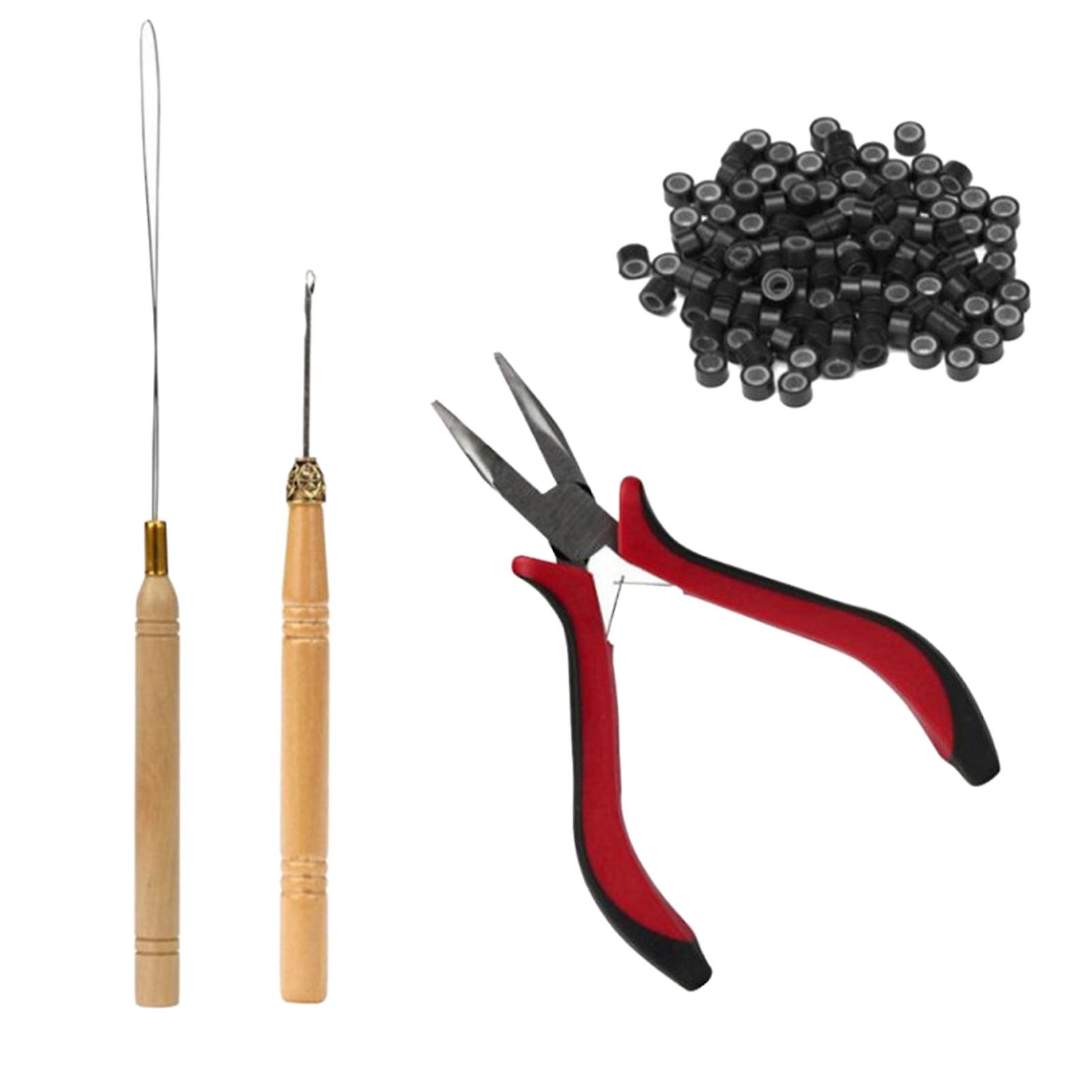 4pcs Hair Wig Plier Curved Tip Wooden Hook Needle Silicone Rings Hair Extension Tools Black