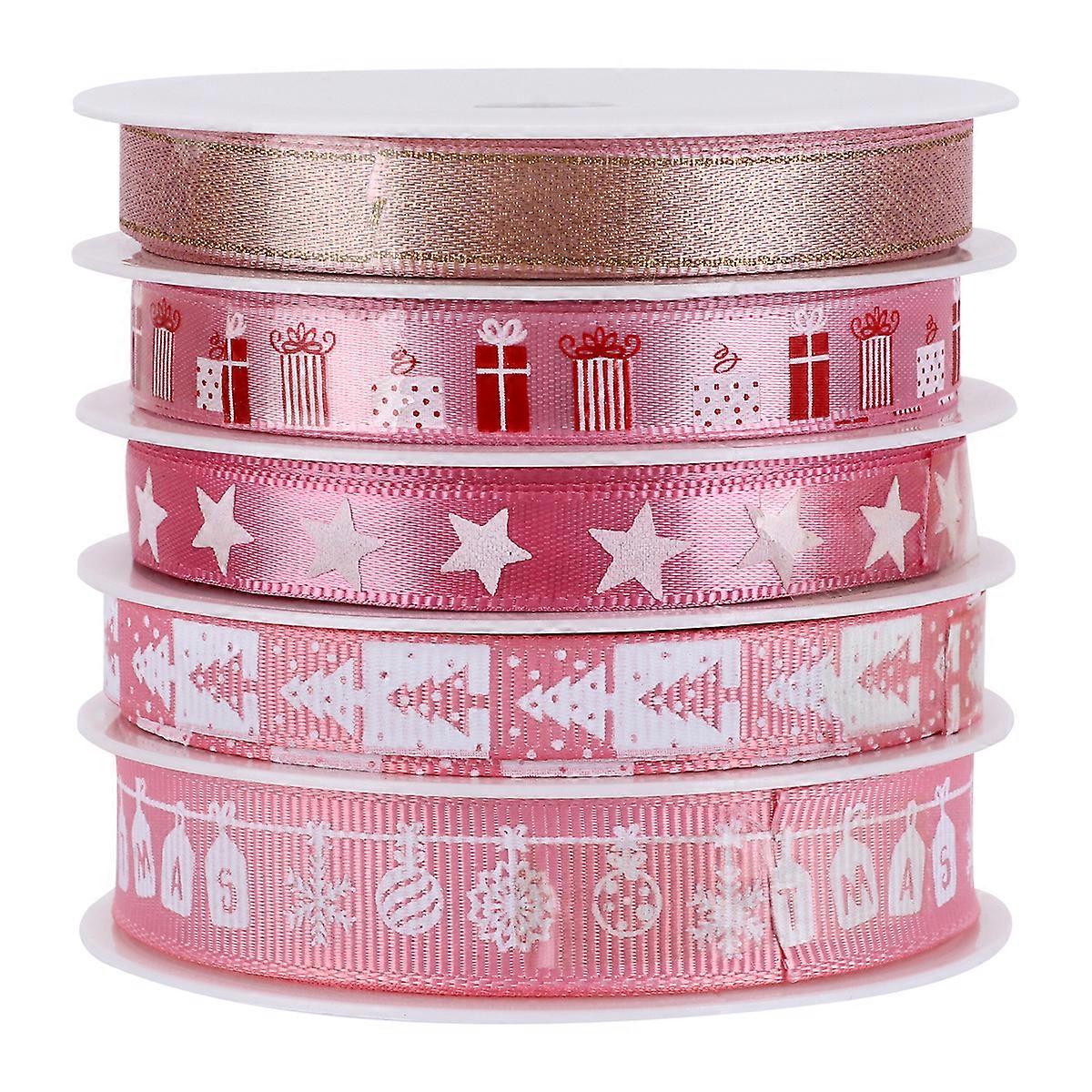5 Rolls of 25m Length Christmas Printed Ribbon Holiday Gift Decorative Band Ribbon for Wrapping DIY Crafts(Pink)