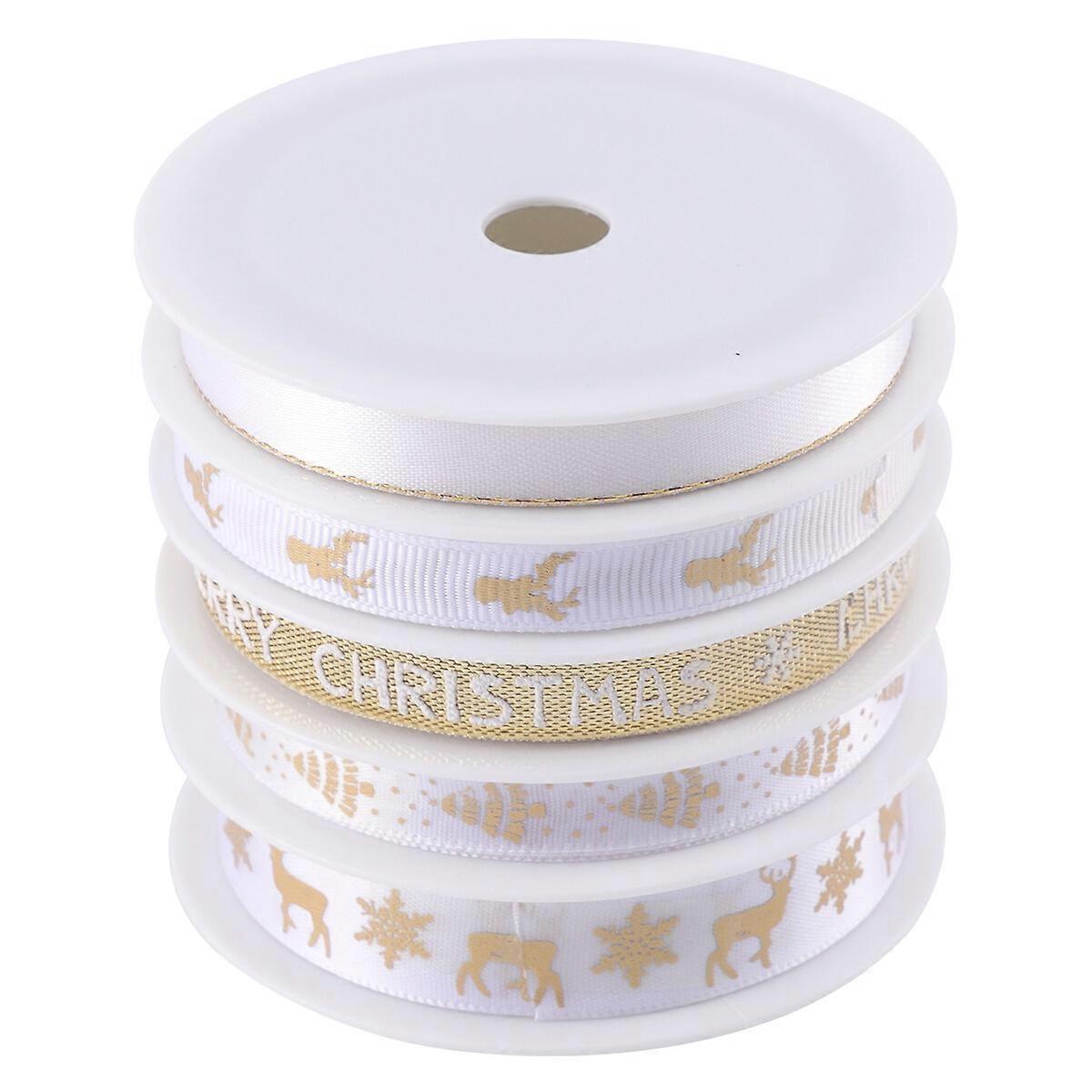 5 Rolls of 25m Length Christmas Printed Ribbon Holiday Gift Decorative Band Ribbon for Wrapping DIY Crafts(White Golden)