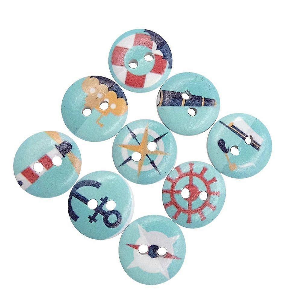 50Pcs 15MM 2 Holes Wooden Buttons Environmental Wide Side Navy Series Printed DIY Press Studs Snaps