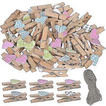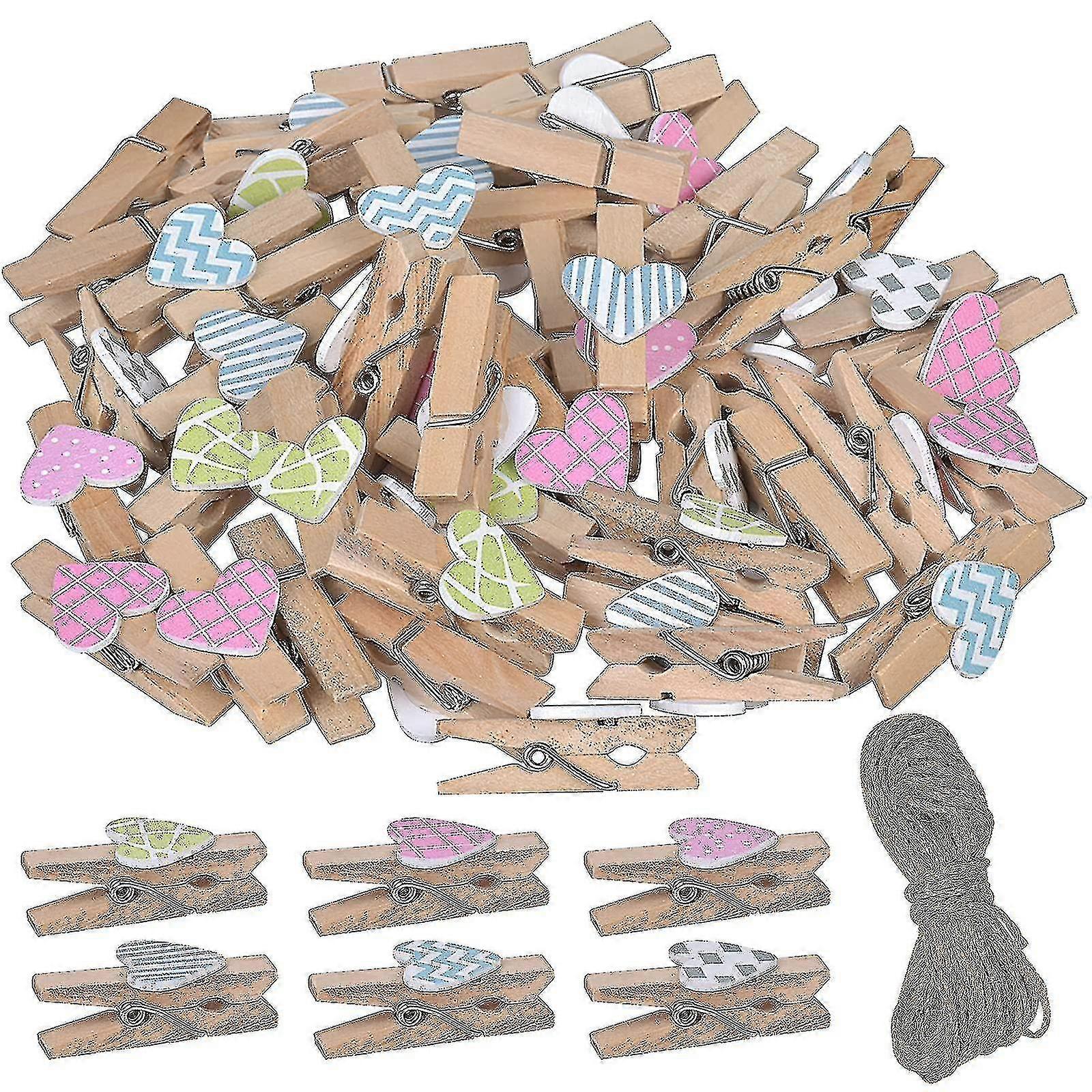 50 Pcs Wooden Photo Clips, Mini Love Heart Shape Photo Hanging Display String And Pegs Set, Six Styles Photo Decor Clips