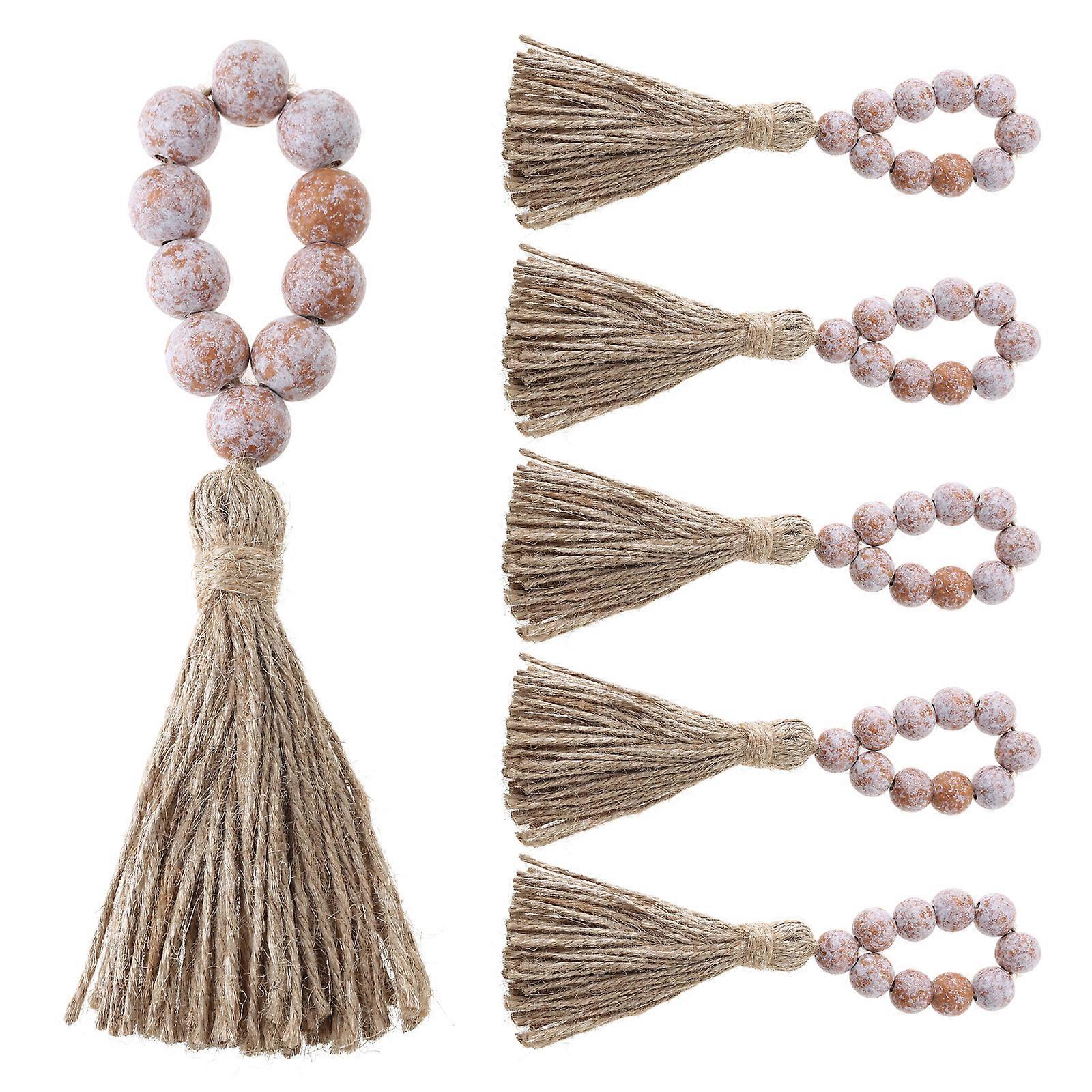 6Pcs Wood Bead Napkin Rings with Tassels Rustic Farmhouse Wood Beads Garland Wall Hanging Decor Weddings Home Decor