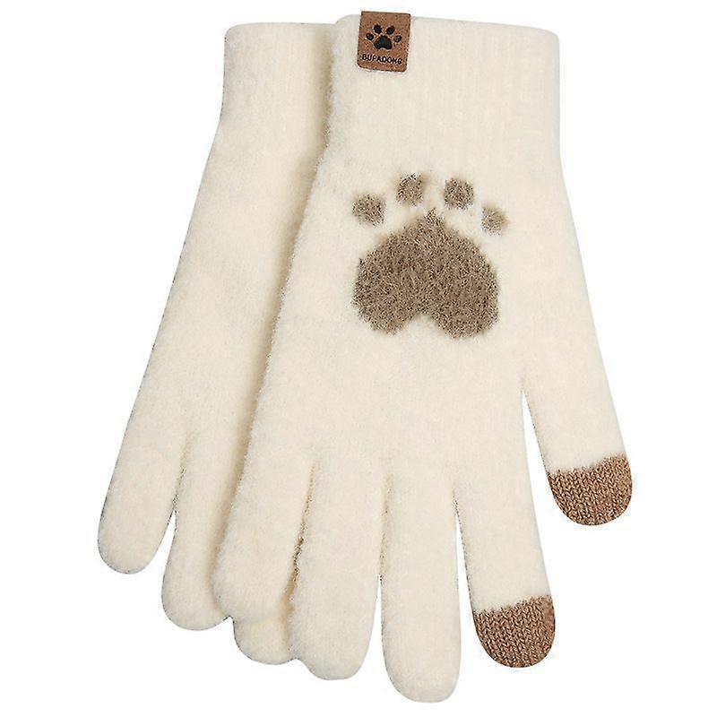 6 Double touch screen cat paw cold proof warm gloves for women Autumn and winter plush thickened wool knitting gloves (off white+bean paste)