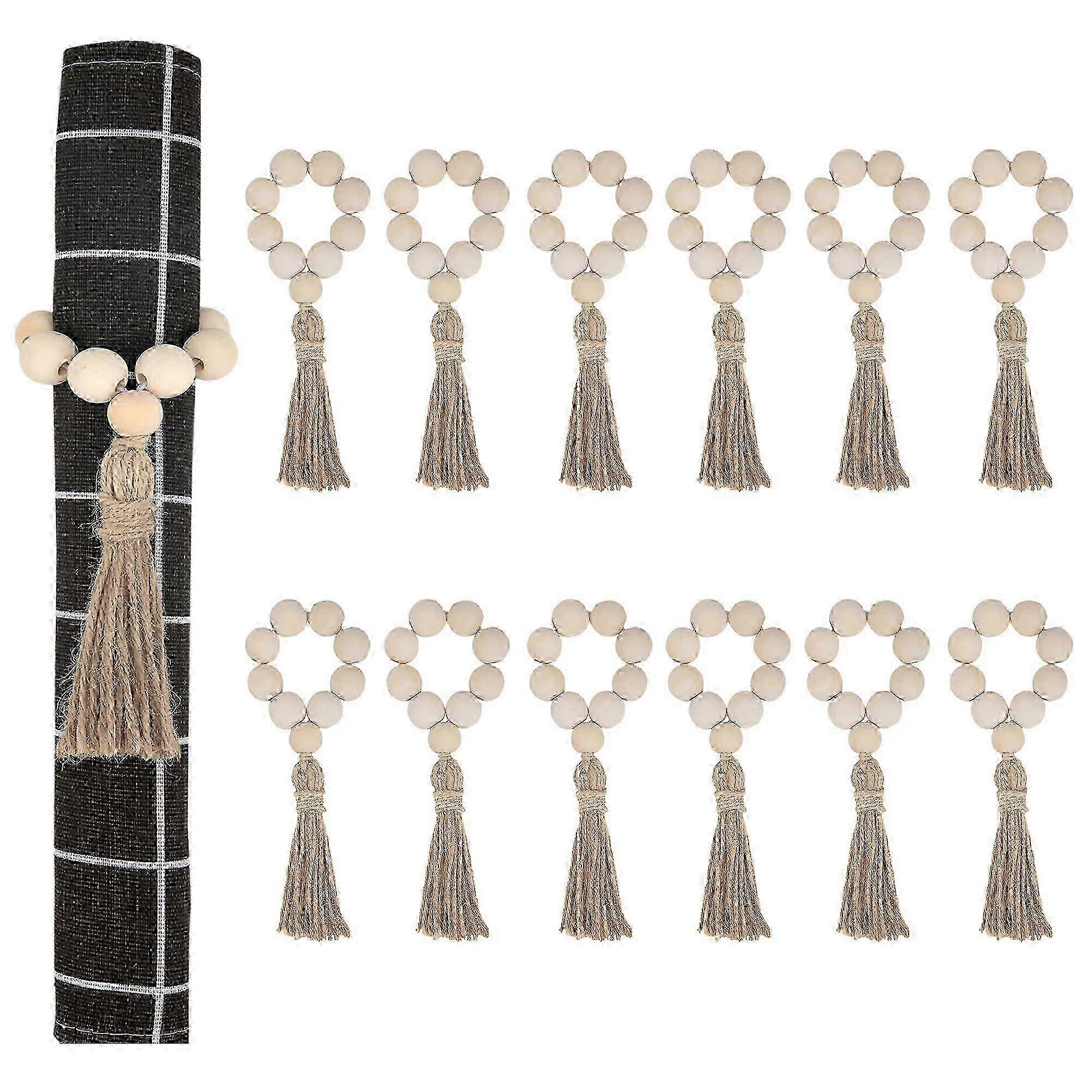 6-Piece Wooden Bead Napkin Rings with Elastic Tassels - Farmhouse Decor