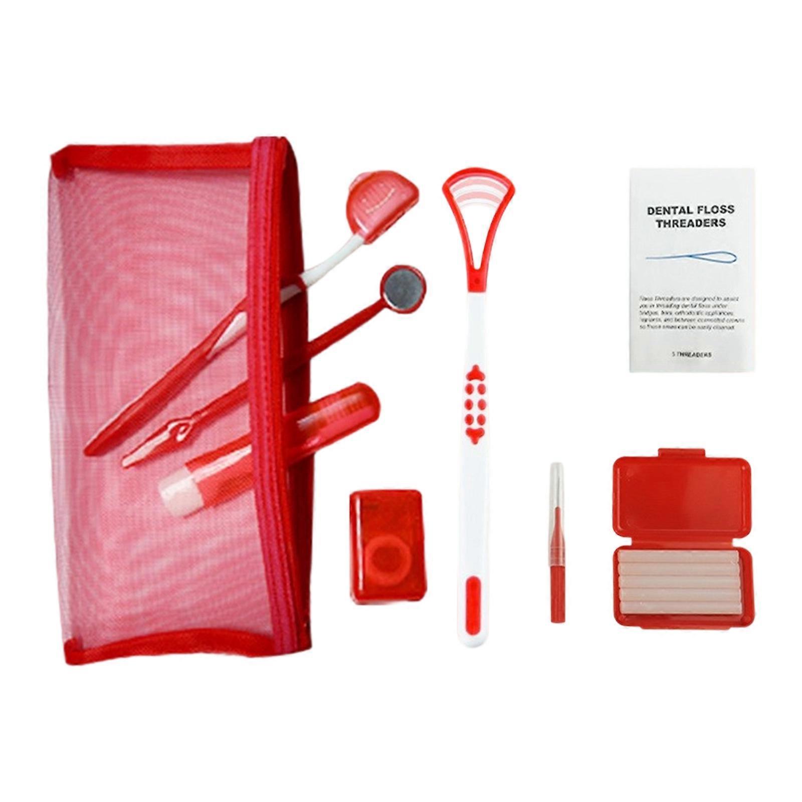 8 Pcs Dental Hygiene Kits Floss Thread Orthodontic Dental Care Kits Teeth Cleaning Kits Dental Wax for Brace Mesh bag red