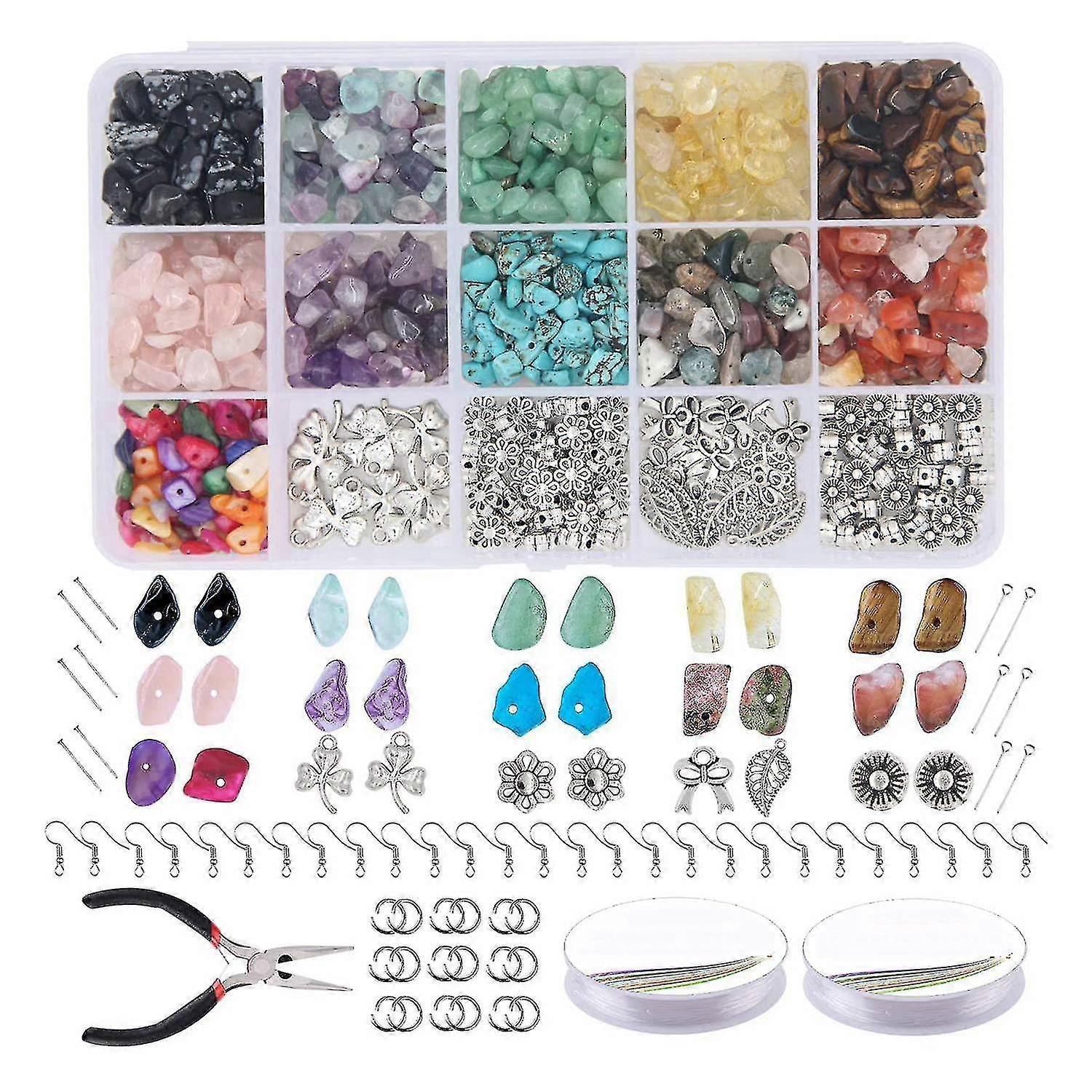 DIY jewelry making kit including 933 irregular chips stone accessories for bracelet and necklace making. Good quality beads pendant for jewelry making, like women's chokers necklaces, earrings, anklets, rings, brooches, pendants and so on.The colored irregular chips stone beads come with 11 colors and each color has 50 pieces (colorful agate, southern red agate, prehnite, kallaite, amethyst, quartz, 's eye, green agate, colored flvorite, obsidian, rutilaterd quartz). The pendant come with 3 different shape. Then the bracelet spacer beads come with 2 types and each type has 50 pieces.These beautifully irregular chips stone beads are made of high quality various precious gemstone assortment. And the variety of colors would make a beautiful visual impression to your handmade jewelry.These jewelry making kits are suitable for jewelry making, gifts, home decoration, collection and beads associated with good luck, balance and confidence, can help you ease your stress and smooth out your anxiety, perfect gift (Birthday gift and Christmas gift) for your friends, family members and for yourself.Colour: picture colourMaterial: glassPackage Contents:50 x colorful stone beads50 x southern red stone beads50 x prehnite stone beads50 x kallaite irregular chips stone beads50 x amethyst irregular chips stone beads50 x quartz irregular chips stone beads50 x 's eye irregular chips stone beads50 x colored fluorite irregular chips stone beads50 x green chips stone beads50 x obsidian chips stone beads50 x rutilated quartz irregular chips stone beads30 x silver cute pendants50 x silver open jump rings50 x silver head pins100 x earing hooks2 x clear bracelet string1 x pilerOnly the above package content, other products are not included.Note: Light and different displays may cause the color of the item in the picture a little different from the real thing. The measurement allowed error is +/- 1-3cm.