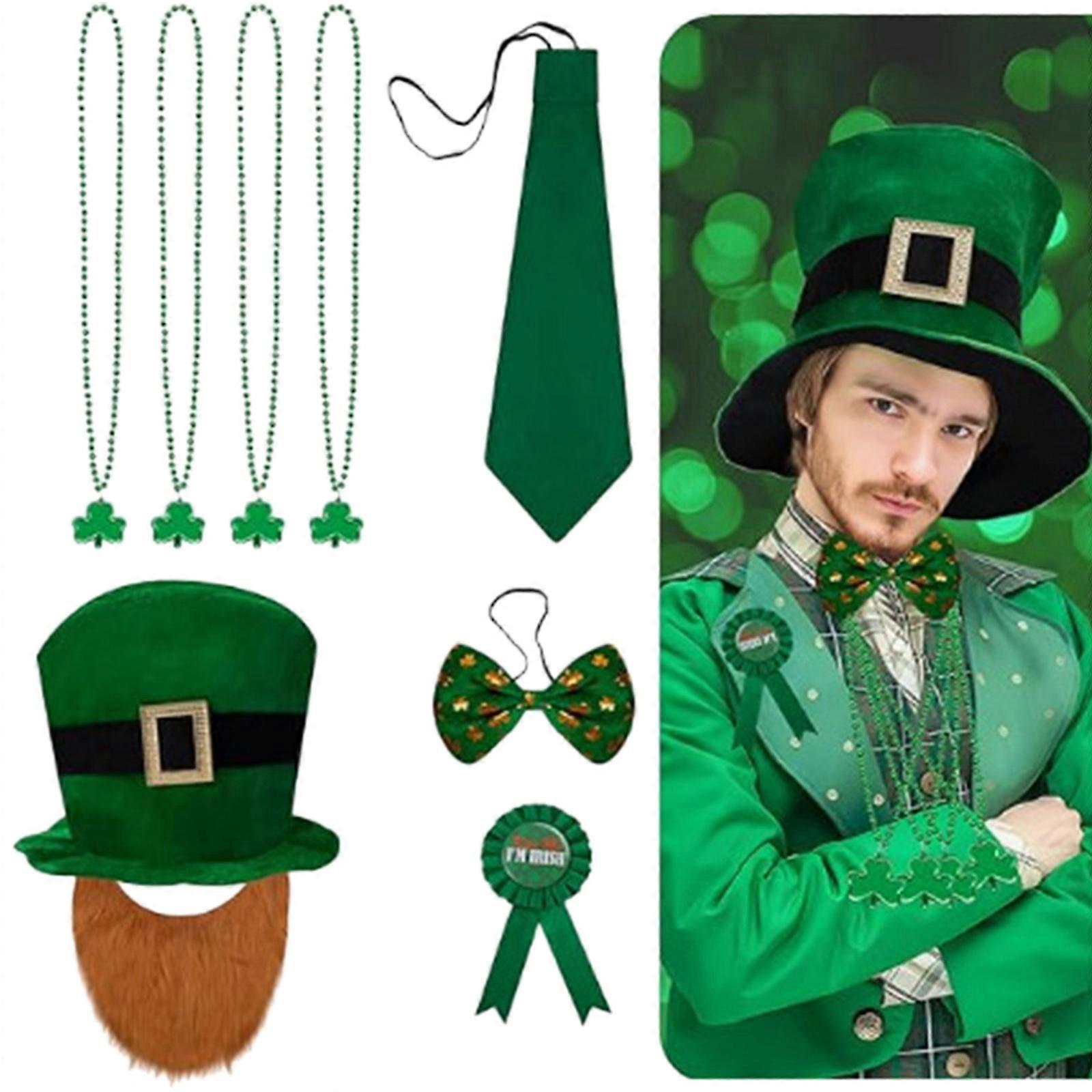 9x Patrick's Day Costume Set Green Shamrock Beads Necklaces Irish Party Green Top Hat Bow Beard for Cosplay Party Green