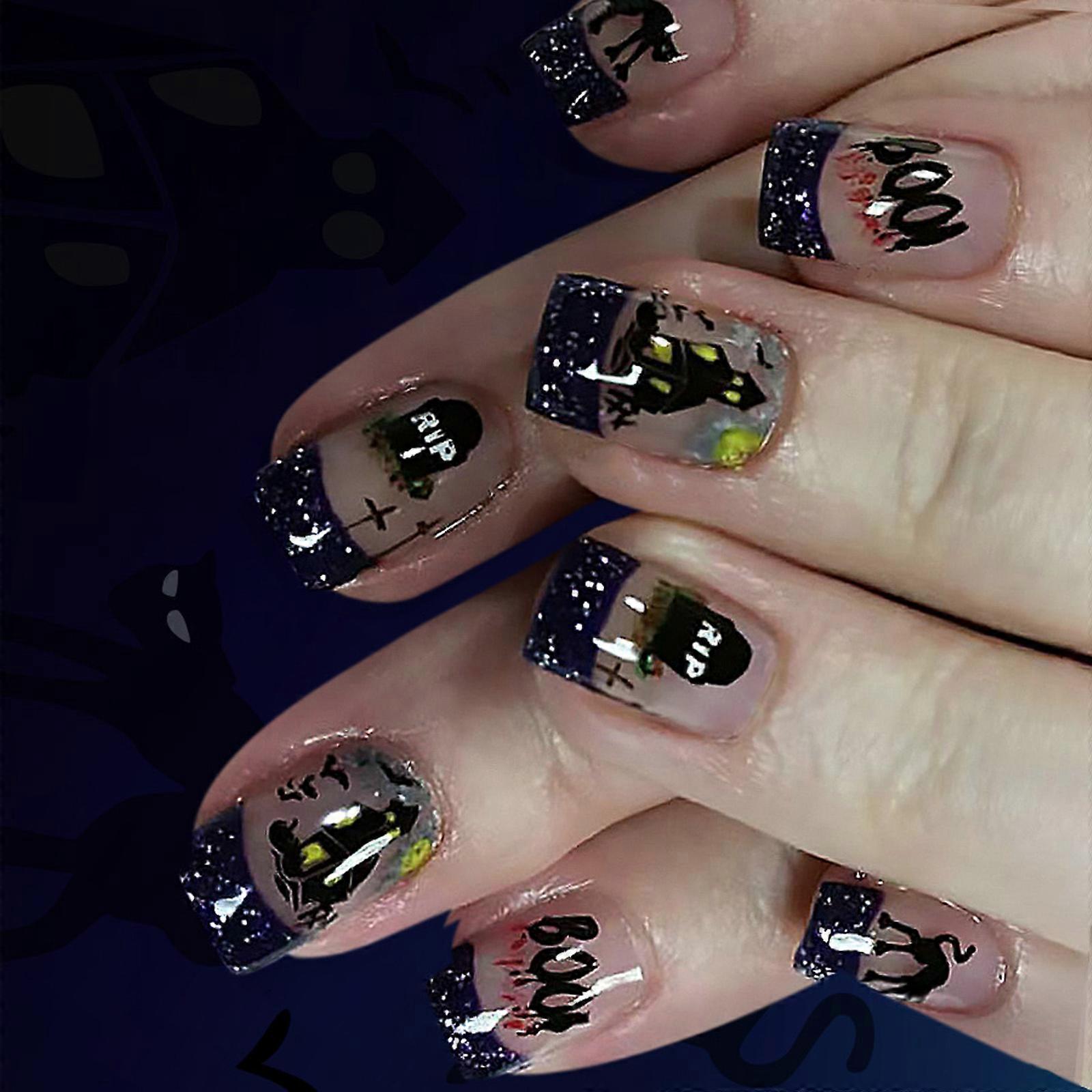 ABS Press On Nail 24Pcs Halloween Glittering French Style Dark Bat Not Require Tools For Party And Daily Use Multicolor