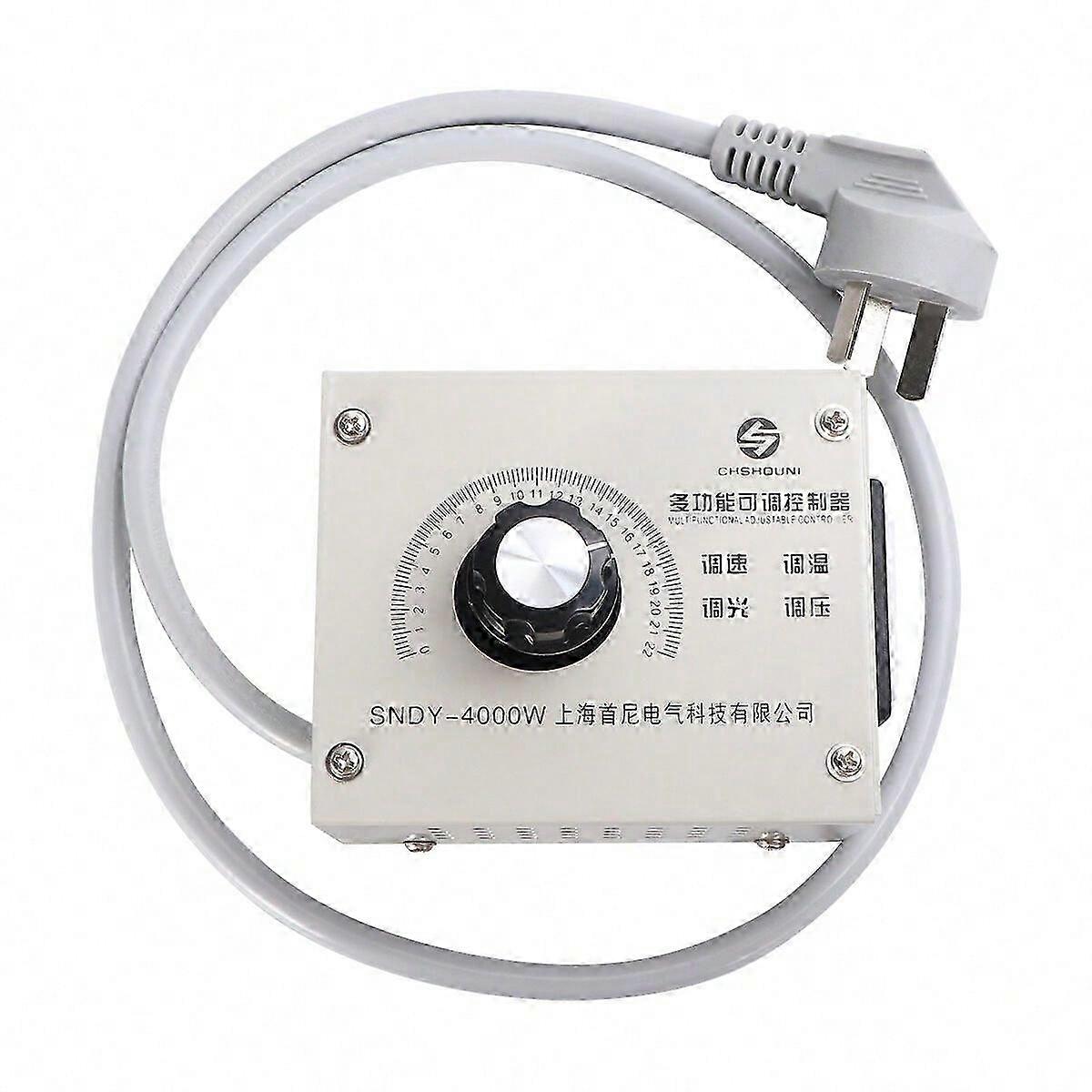 NOTE: This item comes with Chinese type I plug, please confirm the voltage of your area before paling an order. Description Want to control the of the motor? Want to adjust the water temperature for the water is too hot? Want to dim the light according to your requirements? This AC voltage regulator will help you realize all the above things! The regulator is simple to use and can be connected to the electrical appliances by the output, it's equipped with the rotary knob and can be used for controlling light brightness, fan motor or water temperature. With AC 0V-220V continuously adjustable voltage, zero hysteresis, zero latency and superior heat dissipation, the voltage regulator can be applied to large household or small industrial electrical appliances of which power is less than 4000W. A perfect motor controller for household use! Features - Color: As shown - Material: Metal - Size: 10 x 8.3 x 5.2 cm (L x W x H) Input voltage: AC220V Output voltage: 0-220V adjustable (the voltmeter does not work when the output voltage is lower than 5V) Limit power: 4000W (suitable for 2000W-3000W resistive load) Voltage regulation range: 0-220V stepless adjustable (under load conditions) step-down to OV, boost from 10V Rated current: 9A Limit current: 18A Silicon Controlled Rectifier Model: BTA41-600B/800B Product features: zero lag, zero delay, with peak voltage absorption circuit to effectively protect high-power thyristor anti-surge, anti-spike, RC absorption multiple protection - Efficiency (): 95% - AC 0V-220Vwide voltage regulating range, 0-4000W control motor power, applicable to large or small electrical appliances such as electric furnace, lamp, motor, electric stove, electric iron fan, water heater, etc. - The rotary knob for light brightness adjusting, fan speed/ motor or water temperature control, voltage and more control. - Stable, durable and long service life. Zero hysteresis, zero latency, superior heat dissipation. - Easy to use, convenient to connect to the electrical appliances and do not need soldering. - NOTE: The resistive load power should be less than 4000W, and power should be largely reduced(half or more) for inductive or capacitive loads, otherwise controller and load will burn out.Packing list1 x Motor controller