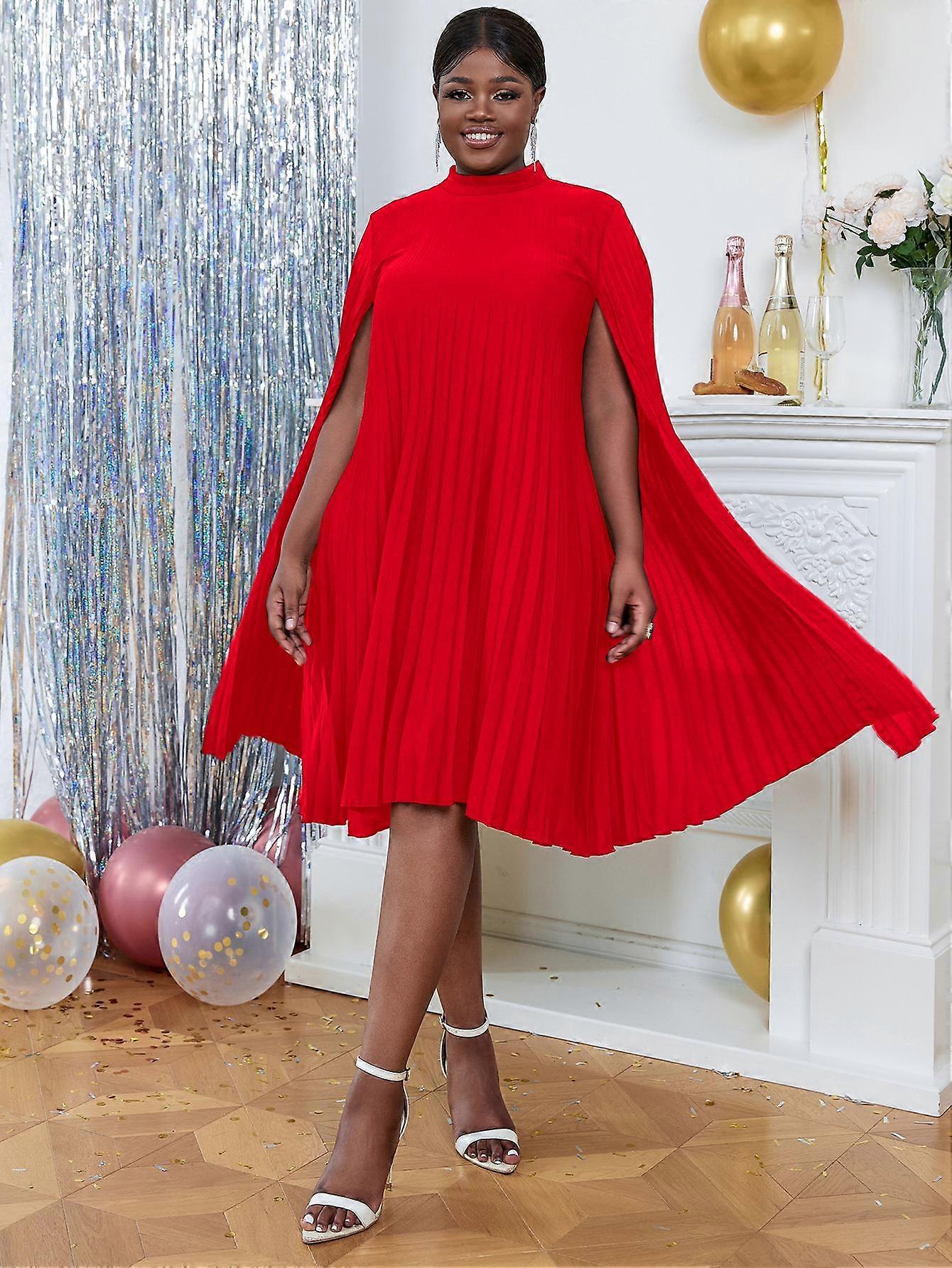 AOMEI Party Dresses for Women Stand Collar Pleated Cape Sleeve Loose Midi Dresses Elegant Lady Evening Wedding Birthday Events Red Outfit