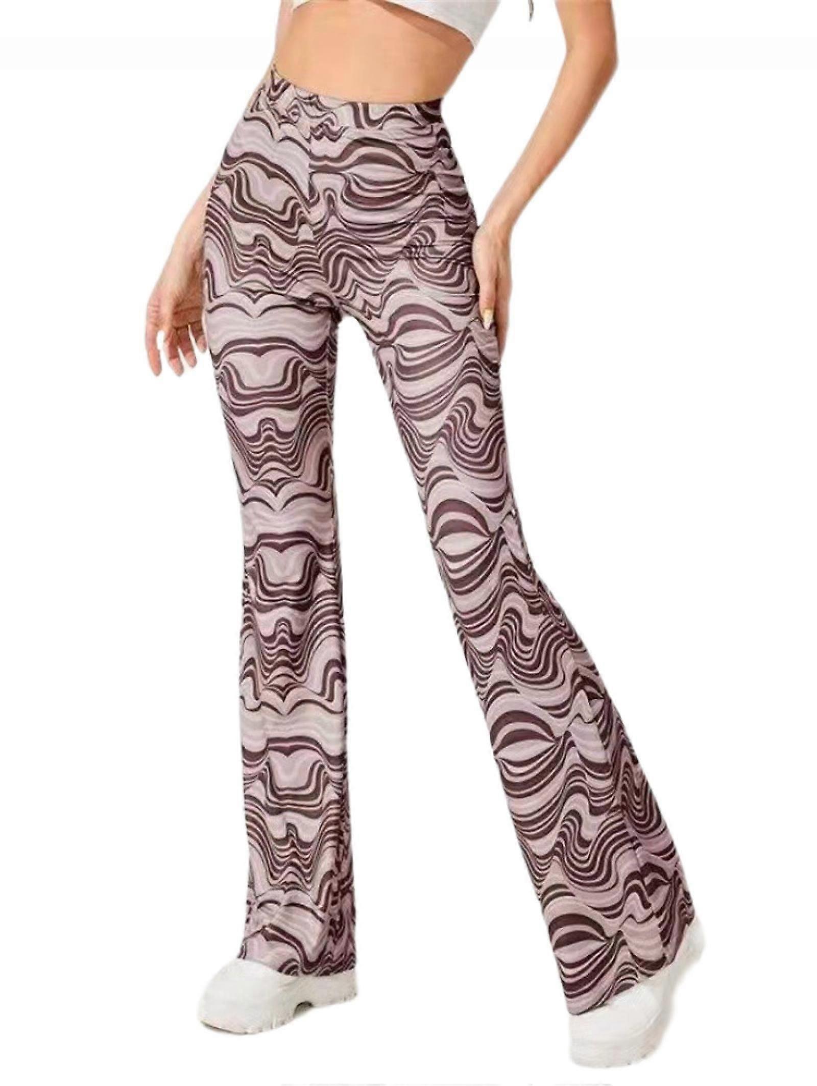 AVEKI Women's Print Elastic High Waisted Flare Leg Bell Bottom Pants, Coffee, XL