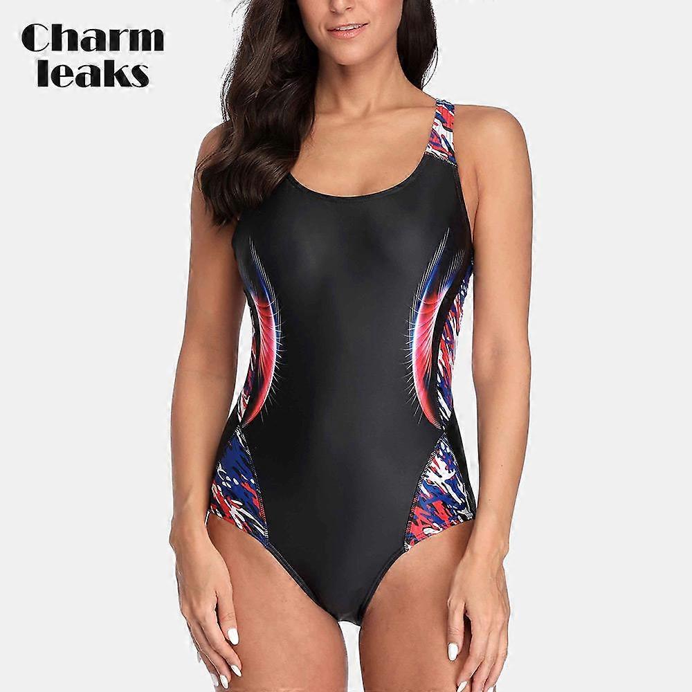 Charmleaks Women One Piece Sports Swimsuit Professional Sports Swimwear Colorblock Print Beach Wear Bathing Suit