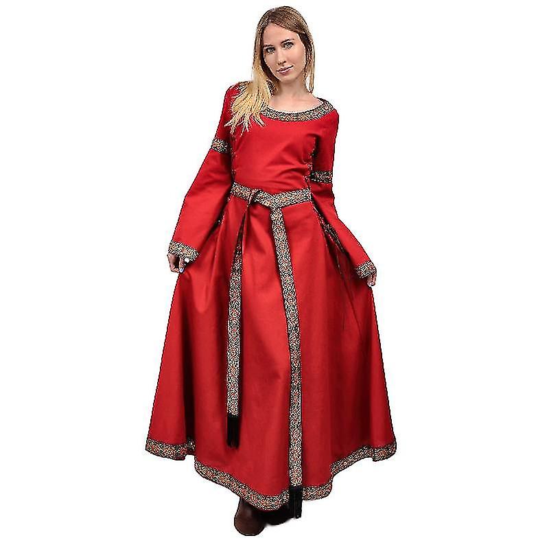 DAZCOS Linen Embroidered Medieval The Viking Queen Dress Renaissance Lace-up Red Wedding Bridal Prom Dress with Tassels Belt
