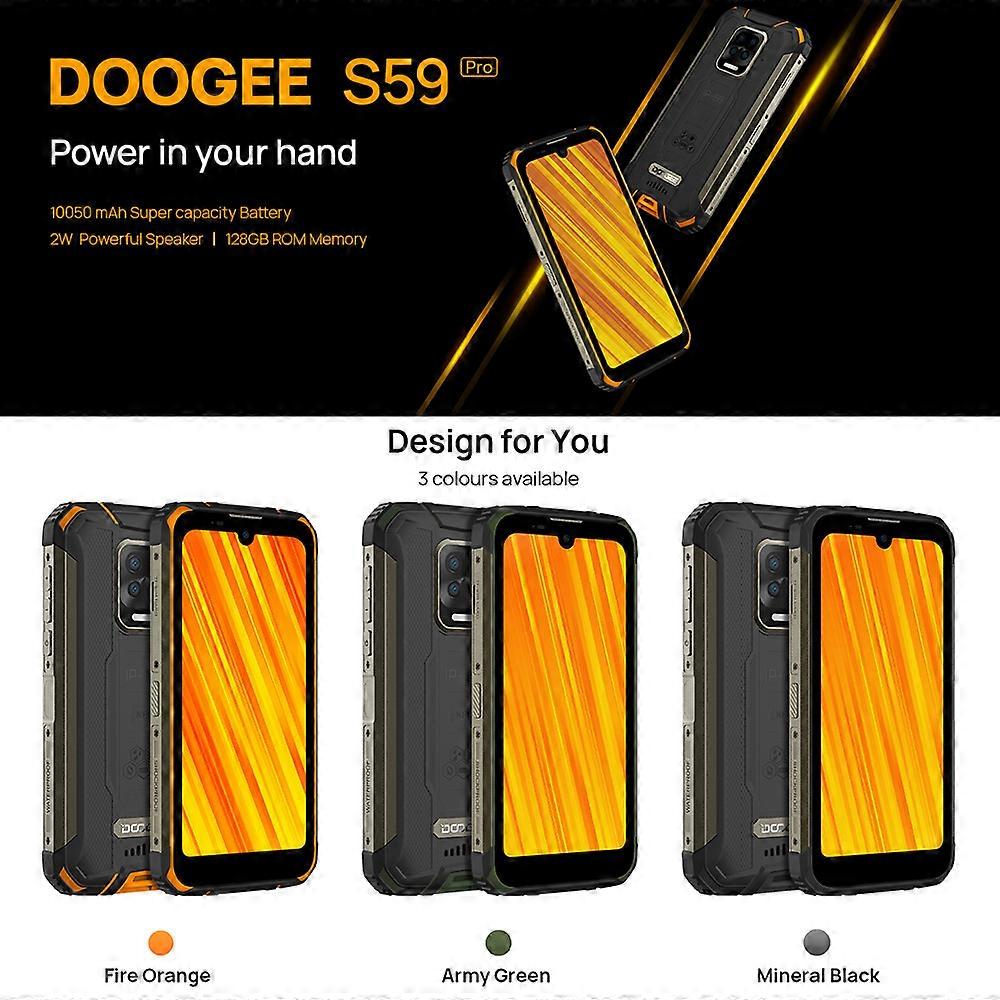 1、【10050mAh Huge Battery for Long-lasting Performance】It can easily last about two days on a single charge and be fully charged in just 3 hours.Enjoy fast charging with 24W wires anytime,anywhere. 2、【Loudest Smartphone Speakers】The DOOGEE S59 Pro comes equipped with a Tonearm box and IC SMART power amplifier. 3、【Military Standard】Certified Military Protection IP68,IP69K and MIL-STD-810G. 4、【Passed 10 Military grade Tests】The DOOGEE S59 Pro passed 10 high-demanding military gradetests To meet MIL-STD-810G standard. 5、【5.71\"Display with Corning Gorilla 】Waterdrop Display Design. Title: DOOGEE Cellphones S59 Pro Smartphone 10050mAh Super Battery IP68/IP69K 4+128GB NFC Rugged Cell phone 2W Loud Volume Speaker Features: 【10050mAh Huge Battery for Long-lasting Performance】It can easily last about two days on a single charge and be fully charged in just 3 hours.Enjoy fast charging with 24W wires anytime,anywhere. 【Loudest Smartphone Speakers】The DOOGEE S59 Pro comes equipped with a Tonearm box and IC SMART power amplifier. 【Military Standard】Certified Military Protection IP68,IP69K and MIL-STD-810G. 【Passed 10 Military grade Tests】The DOOGEE S59 Pro passed 10 high-demanding military gradetests To meet MIL-STD-810G standard. 【5.71"Display with Corning Gorilla 】Waterdrop Display Design. Specification: Model:S59 Pro Operating system:Android10.0 Memory:4G RAM+128G ROM DDR4 External Storage:T-Flash Card up to 256GB Battery:10050mAh, 12V/2A Charger Charger interface:Type-C USB Headphone port:3.5mm Color:Black,Orange,Green(Optional) Package list: 1*Cellphone 1*Type-C USB Cable 1*Charger (12V/2A) 1*Anti-explosion film(pre-applied) 1*Anti-explosion film 1*Card Slot Opener 1*Sling 1*Packing Box 1*Manual 1*Warranty Card 1*Cellphone 1*Type-C USB Cable 1*Charger (12V/2A) 1*Anti-explosion film(pre-applied) 1*Anti-explosion film 1*Card Slot Opener 1*Sling 1*Packing Box 1*Manual 1*Warranty Card