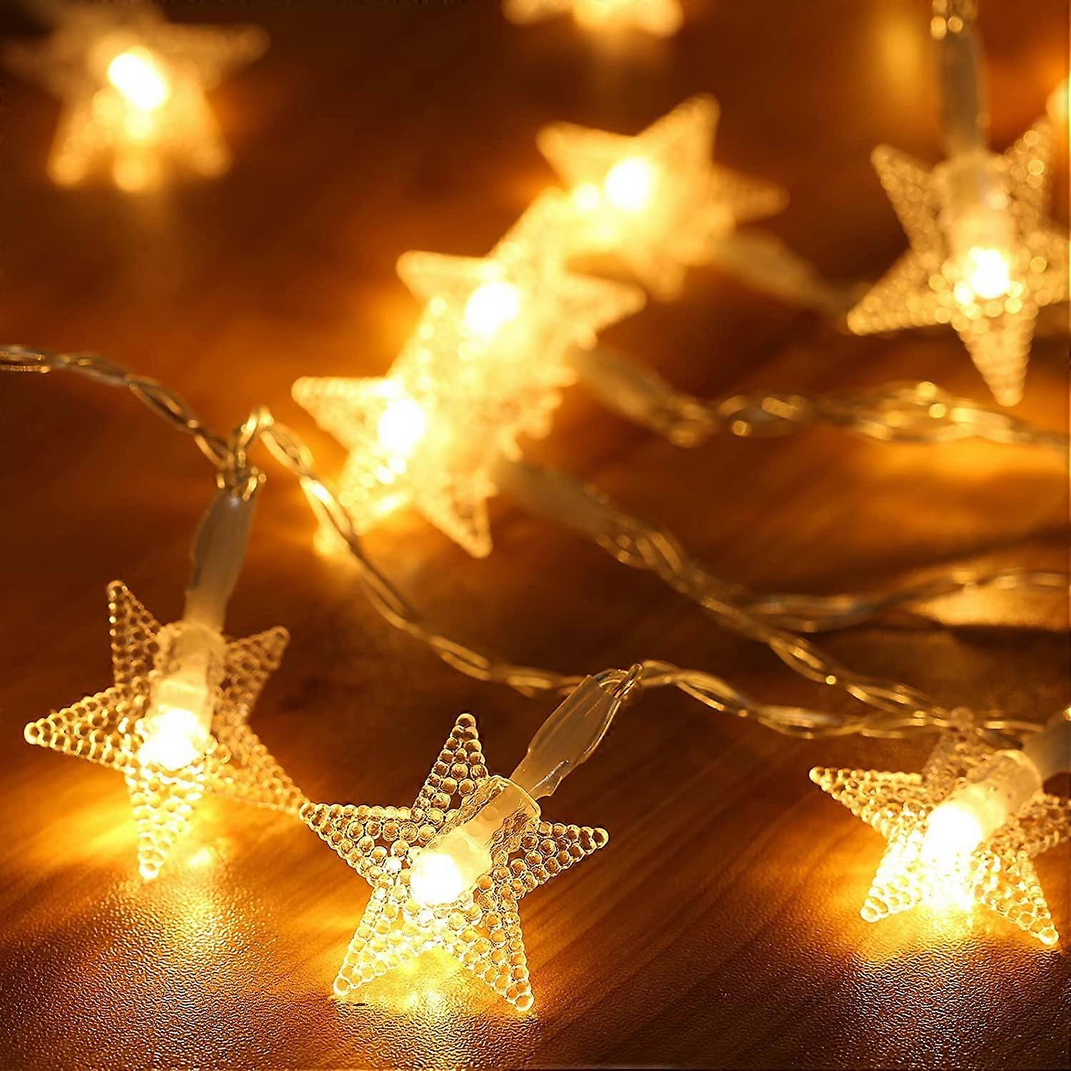 80 LED Christmas Decoration Light: 2 Pack of 40 Star Lights for Christmas equipped with a total of 80 LEDs, measure a length of 6 m/pack. Perfect for use as a lighting addition to any decorative project. With a stable 360 degree viewing angle, they illuminate in all directions to light up your nights. Made of high quality material, it is safe, durable and the best indoor string lights. Cute Design & 2 Lighting Modes: star string lights for Christmas helps free up more places and emits charming light for you like the real stars. With 2 steady and twinkling lighting modes to meet different requirements, these Star Fairy Lights make your place in warm starry amber glow and create a warm and sweet atmosphere for you, which will add much more romantic. Easy to Use and DIY: Powered by 3 AA batteries (not included), just install the batteries, then press the button, the star string lights will work. Made of high quality copper wire, these indoor Christmas star lights can be curved and made into any shape. No matter house, trees, deck, patio, furniture or any other places, you can easily decorate your indoor and outdoor space. Perfect Decoration: Each LED casts warm white light soothing and creates a warm and romantic atmosphere, making it a star string lights for indoor and outdoor decoration. Perfect for various occasions such as bedroom decoration, Valentine's Day, wedding, home, window, bathroom, wall, show, restaurant, hotel, commercial building, center commercial, etc.